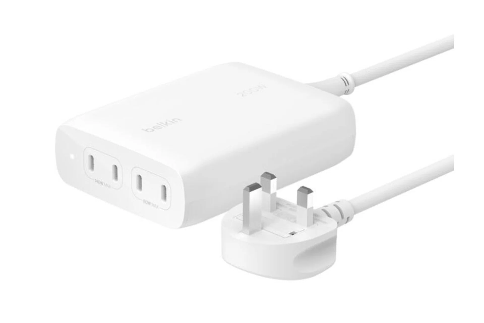Power a laptop and three additional devices with this four-port GaN charger from Belkin. With three USB-C and one USB-A por, you can charge a 16-inch MacBook Pro from 0-50% in 30 minutes or a Samsung Galaxy S23 to 50% in 28 minutes. Read our hands-on review of the Belkin 140W Boostcharge Pro