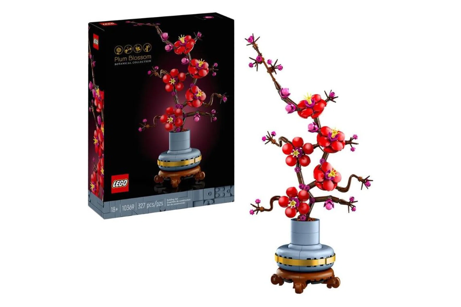 The Lego Plum Blossom plant set has a woody stem and vivid red-and-magenta flowers and sits in a pastel-blue and gold vase on a wood-effect plinth. Combine this with others from the Botanicals series and create a space for relaxation.