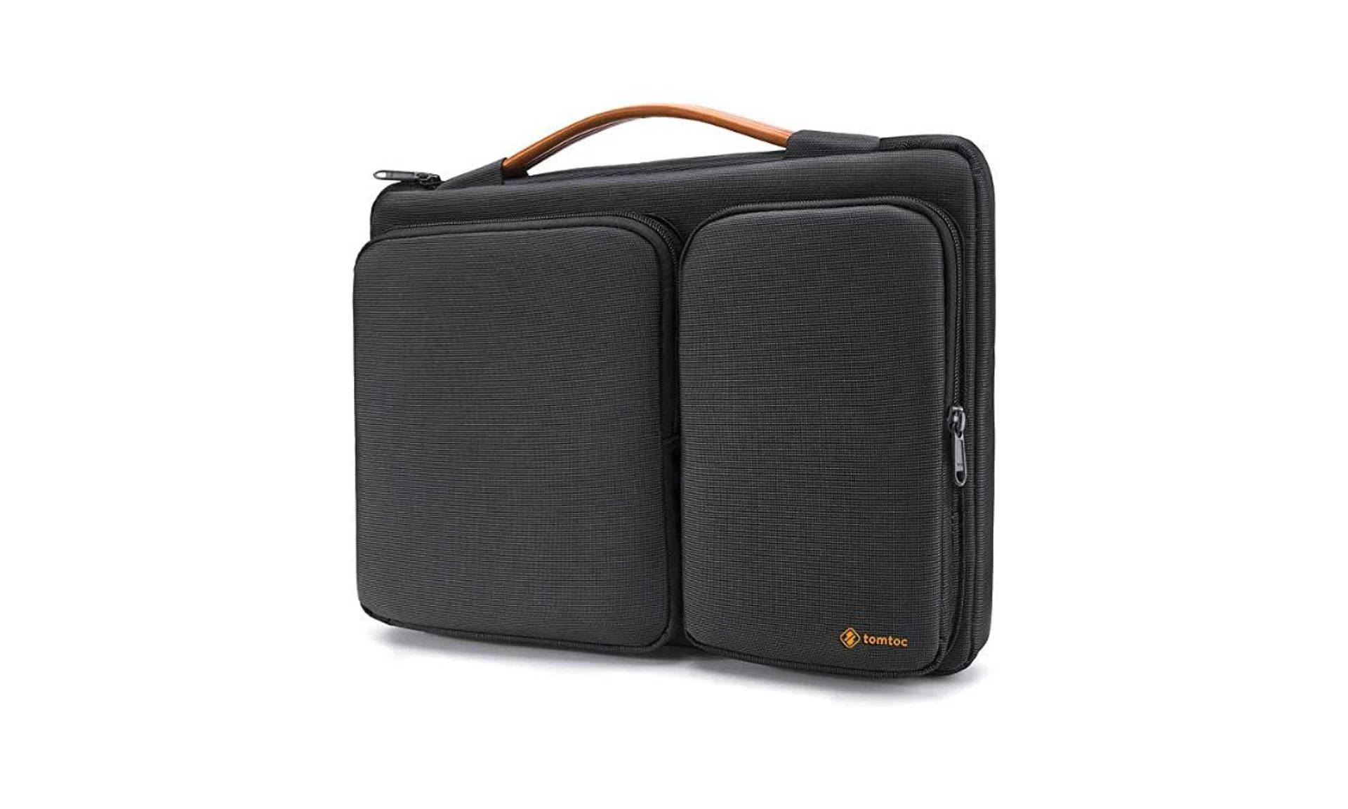 The tomtoc 360 Protective Laptop Sleeve offers excellent protection for your MacBook with its durable, multi-layered design. It has a soft, padded interior and an impact-resistant polycarbonate shell that effectively absorbs shock. The sleeve also features a waterproof exterior to protect against spills and rain, ensuring your laptop stays dry. It is compatible with MacBooks up to 14.4-inch, and other 14-inch laptops. The sleeve also has front pockets where you can store your tablet and smartphone, so you can secure all your devices in one place. Its slim, lightweight design makes it easy to carry on its own or in your bag.