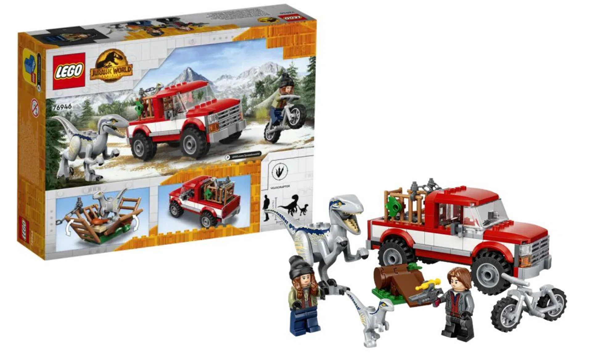 Inspired by the Jurassic World Dominion movie, this set features the dinosaur minifigures Blue and Beta, truck, bike and even food to lure them into the dino cage.