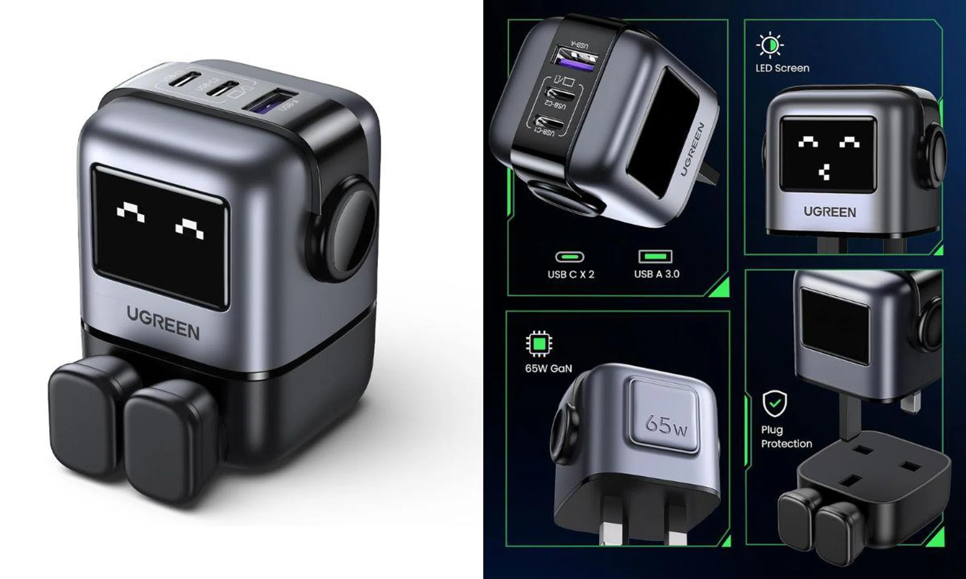 This cute little guy has two USB–C ports and one USB-A port for fast charging, and an LED display that changes expressions according to charging status.