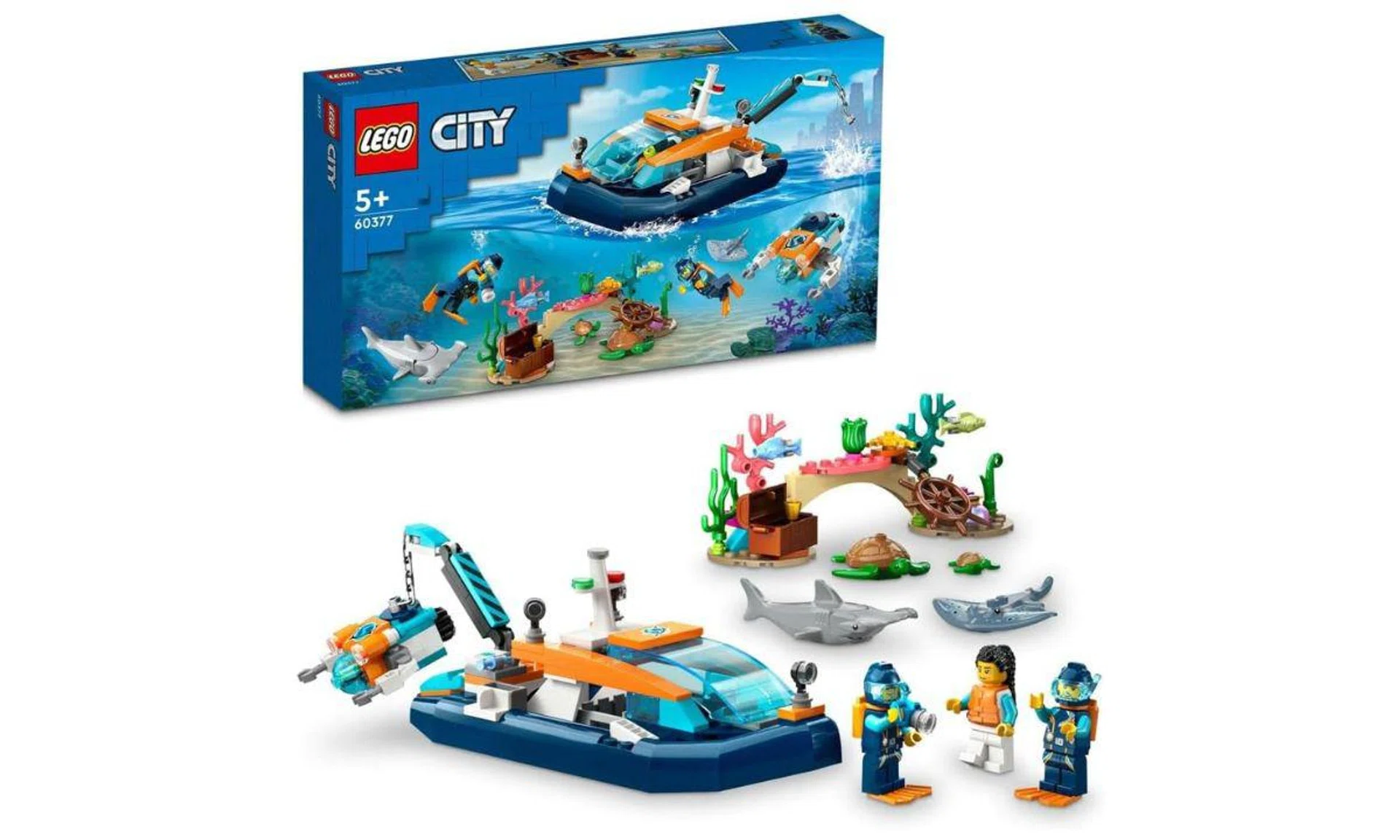 Set sail for fun! This detailed set lets kids 5 and above play undersea explorer and build an inflatable boat, minisub and vibrant coral reef. It also includes 3 explorer minifigs for more imaginative underwater adventures.