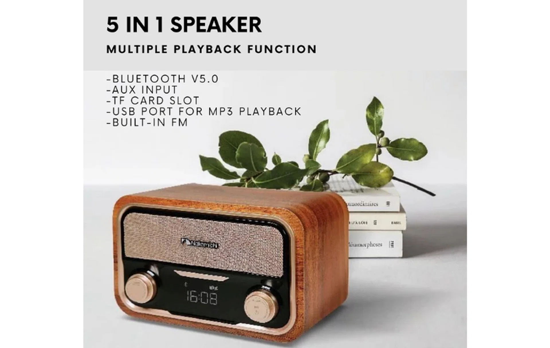 It looks like a retro radio, but housed in its vintage wooden design is a portable Bluetooth speaker with FM radio that delivers clear vocals and rich bass.