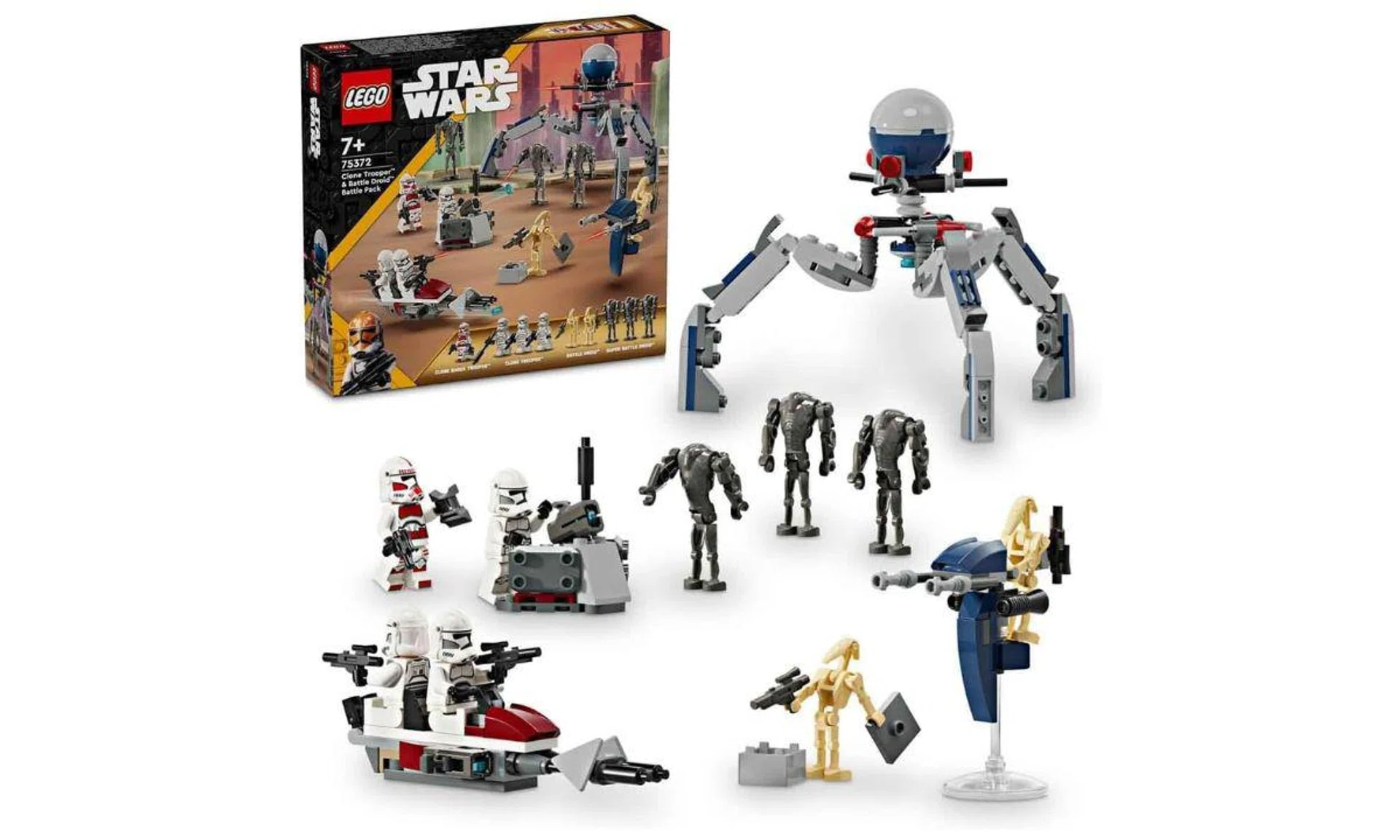 A great starter kit for Clone Wars play, this set is packed with 9 minifigs, including troopers, super battle droids and a Clone Shock Trooper. There’s also a flick-fire tri-droid, a stud-shooting speeder bike and STAP, ready for kids to stage full-scale battles.