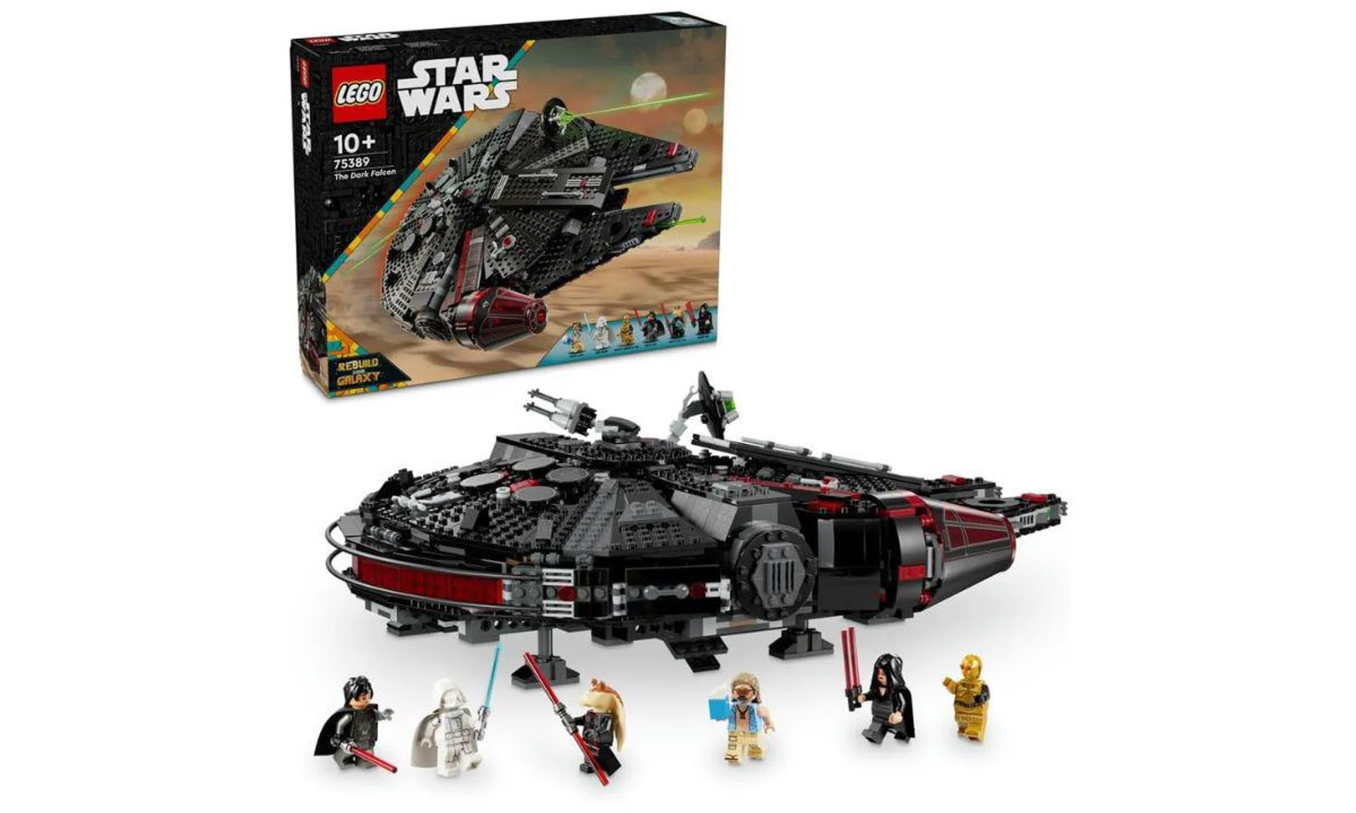 Meet the Millennium Falcon’s dark side. Straight from the Lego Star Wars: Rebuild the Galaxy special, this twisted take on the classic ship is packed with playful surprises, including Darth Jar Jar’s throne, a jail cell, and an entertainment area. Flip up the top to explore inside, fire off spring-loaded shooters, and rotate the cannons for battle mode.
