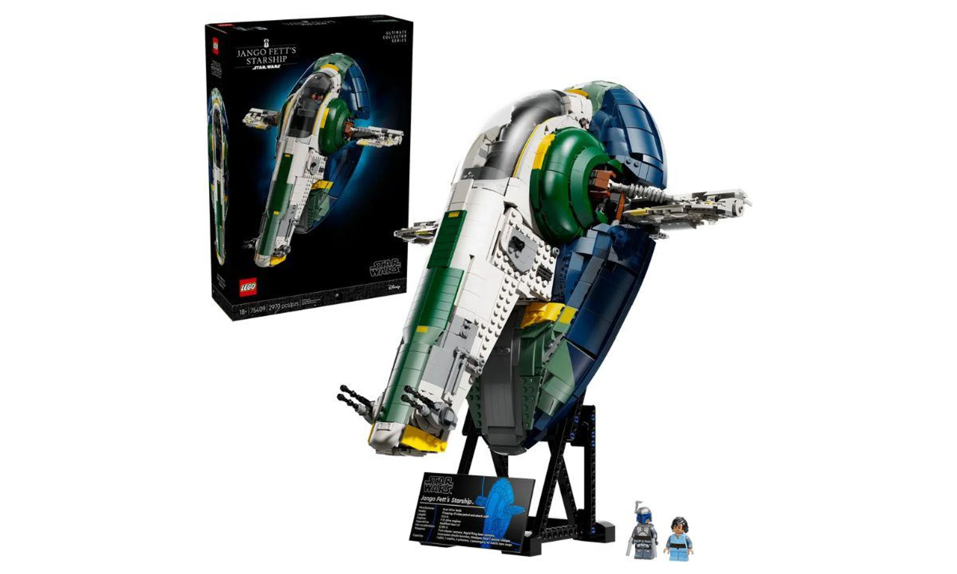 This prequel-era classic gets the UCS upgrade it deserves. Jango Fett’s signature ship is brought to life with an impressively detailed build featuring a tilting display stand, adjustable wings, spring-loaded shooters, and a storage bay for a seismic charge. You’ll also get minifigs of Jango and young Boba, the original Mandalorian duo before Din and Grogu came along.