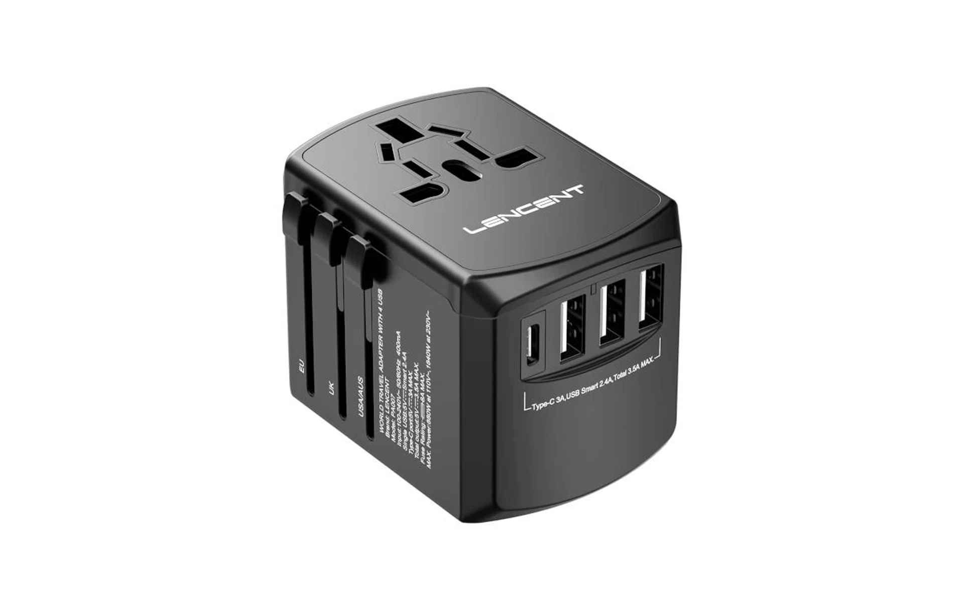 This compact universal adapter can travel with you almost anywhere in the world. It comes with a universal AC socket, three USB ports and one type C port for fast charging. Suitable for all EU, UK, US and Australia plugs.