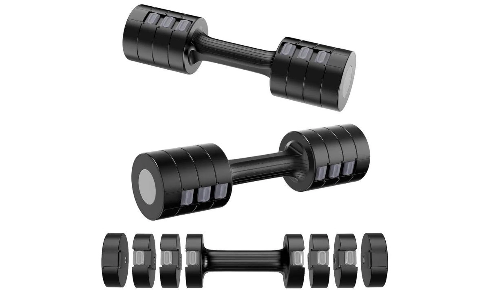 These cool dumbbells pack 4 weights in one – 0.9kg, 1.4kg, 1.8kg, and 2.3 kg (2, 3, 4, 5 lbs) - meaning no more heaps of weights lying around! They snap securely with a click, and offer a super comfy and slip-free grip.