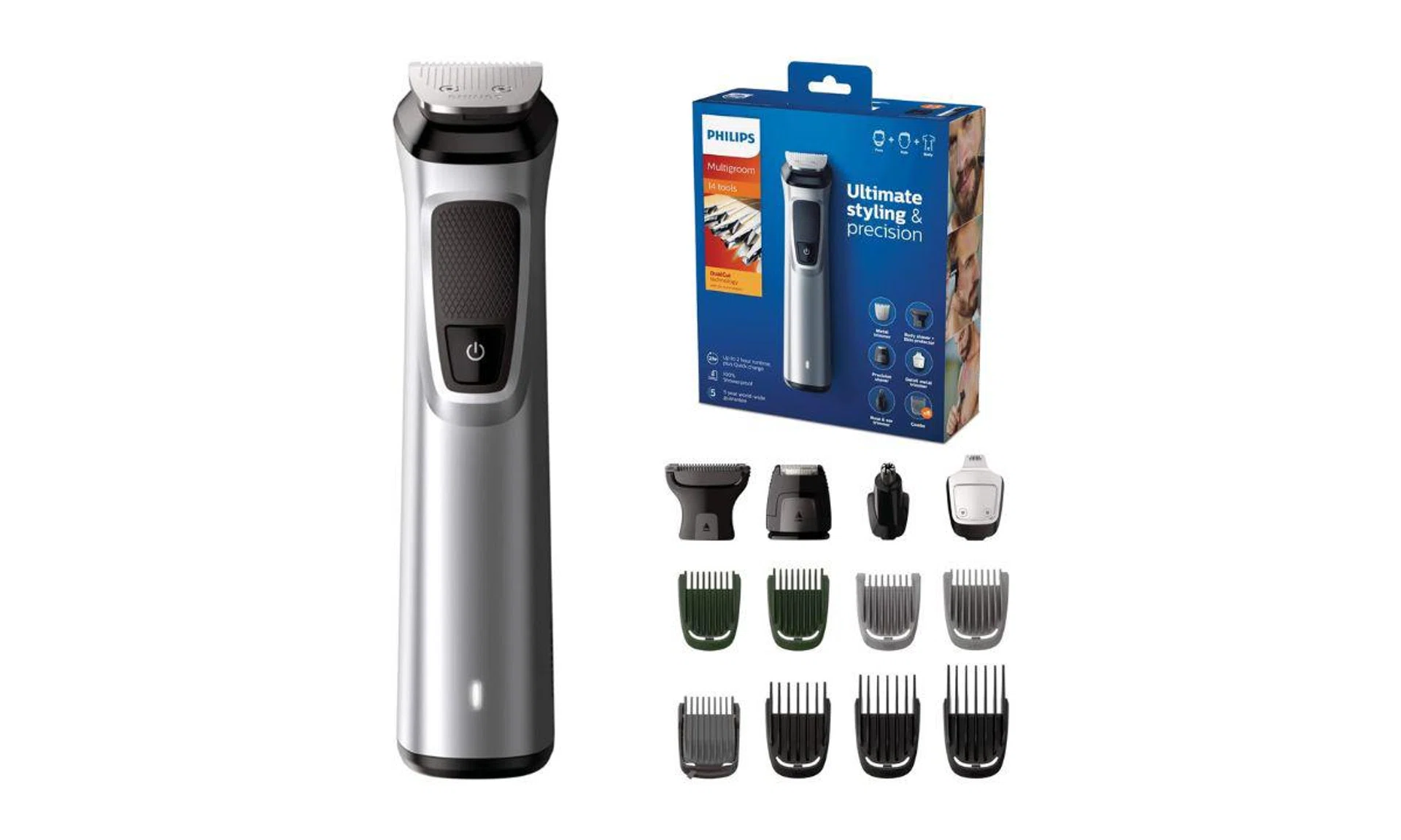 This versatile grooming tool for men comes with 13 attachments for trimming and styling hair, beards, and body hair. It has a powerful battery and is water-resistant for easy cleaning. The MG7720 also has a digital display that shows the battery level and cleaning indicator.