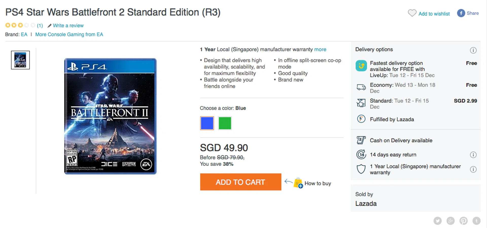 With Star Wars: The Last Jedi just around the corner, indulge in your Star Wars fantasies with Star Wars Battlefront II. This action shooter improves on its predecessor by featuring a single-player story mode, which takes place between Return of the Jedi and The Force Awakens. The game also features extensive multiplayer game modes and supports a maximum of 40 simultaneous players for epic battles. You can get it from Lazada for S$49.90, which represents savings of nearly 38%.
