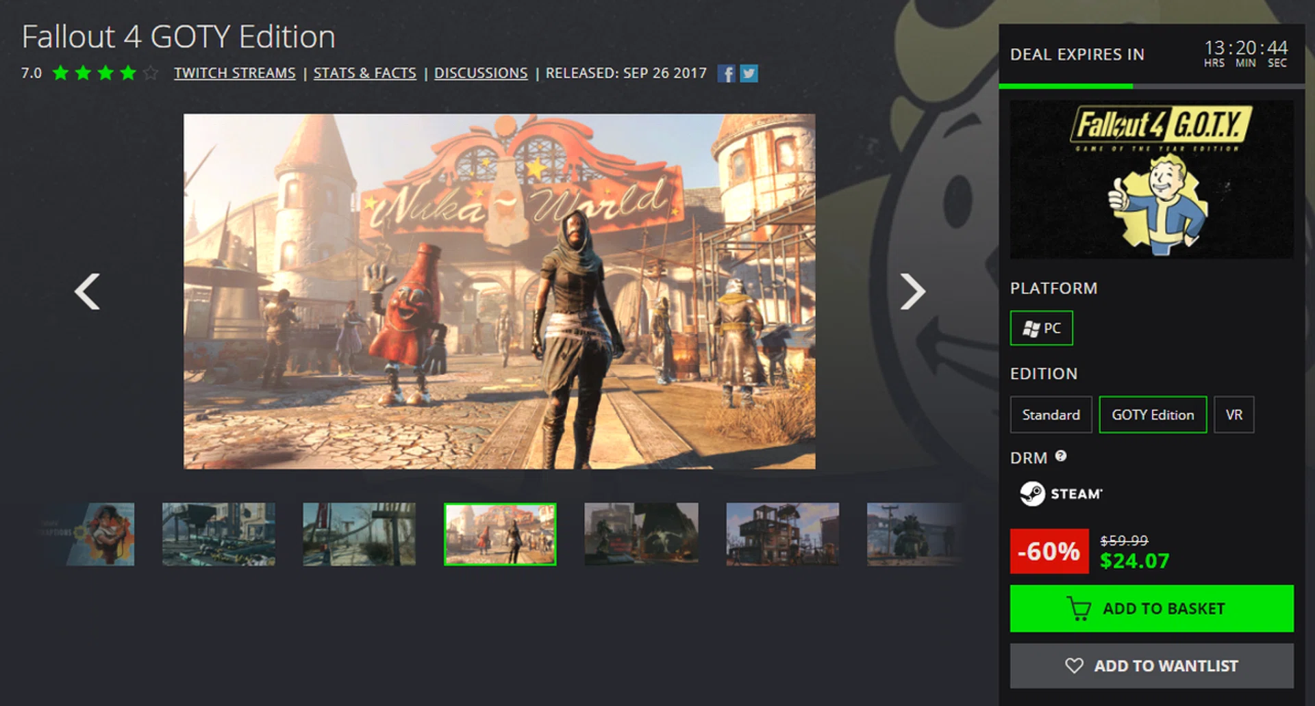 Fallout 4 GOTY Edition usually retails for US$59.99 but you can get it today on Green Man Gaming for just US$24.07!