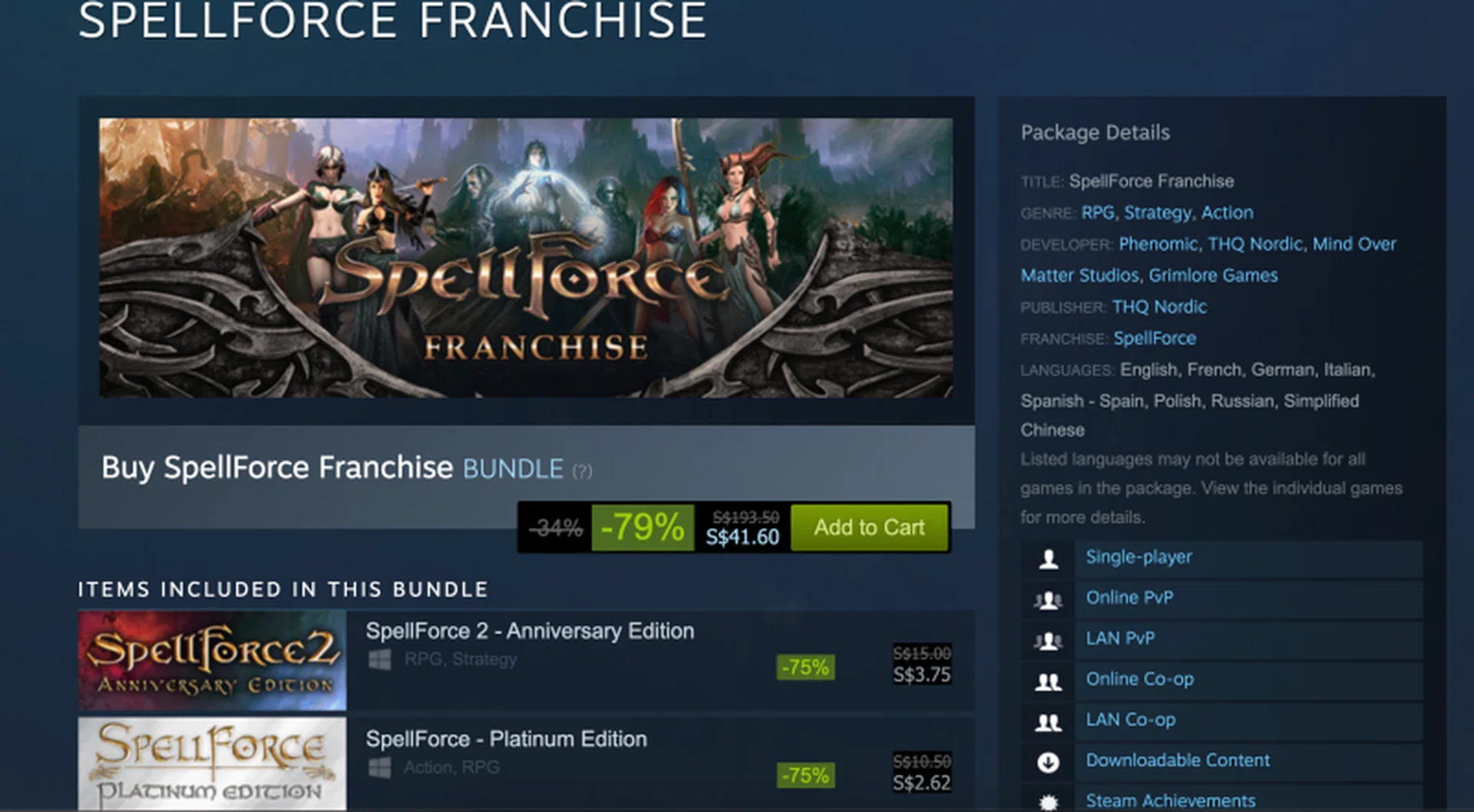 Battle the forces of evil with your party in this action, strategy, roleplaying game. Mysterious powers arise from darkness and shadow. They are threatening Eo, the world of SpellForce, already devastated by wars and sundered by intrigues. Become a hero and unite powerful heroes and armies under your banners, as only with joined forces you can combat this threatening doom! And do it now for almost 80% off the usual price of S$193.50 and get it now for only S$41.60.