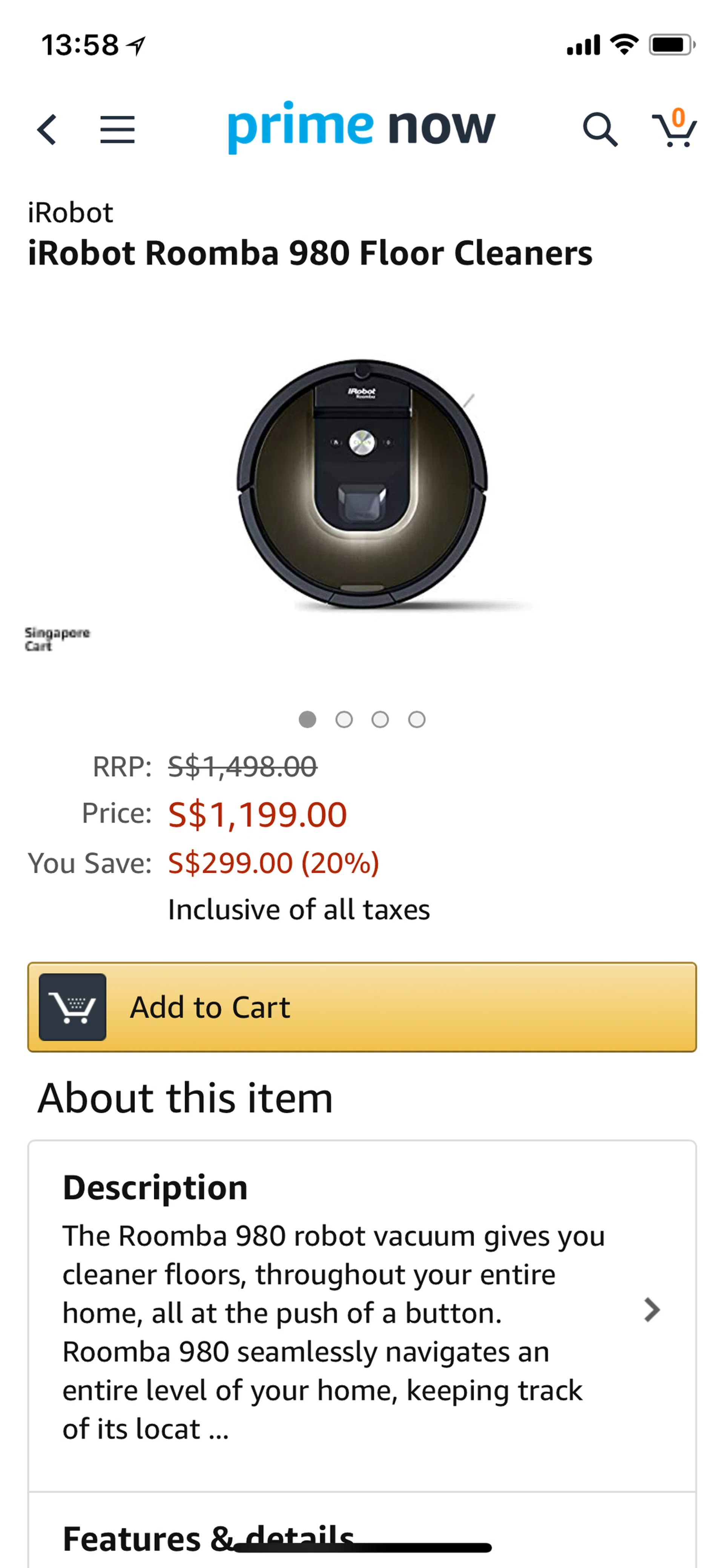 The Roomba 980 usually goes for S$1,498, but you can get it today for S$1,199.