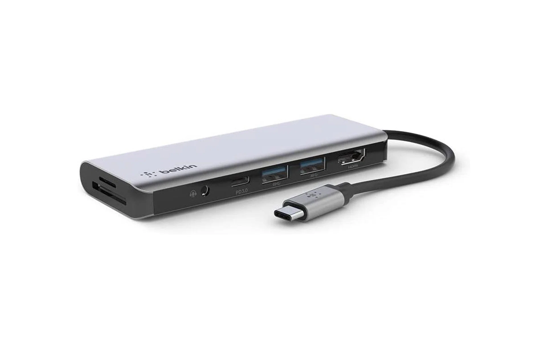 Connect everything you need with the Belkin AVC009btSGY USB-C 7-in-1 Multiport Hub Adapter. The slim, portable USB-C adapter is well suited for those travelling to and from work and home and looking to connect USB-C devices to projectors, monitors, SD and MicroSD cards, headphones, microphones, and thumb drives. It also comes with pass-through charging up to 100W and a HDMI 1.4 port.