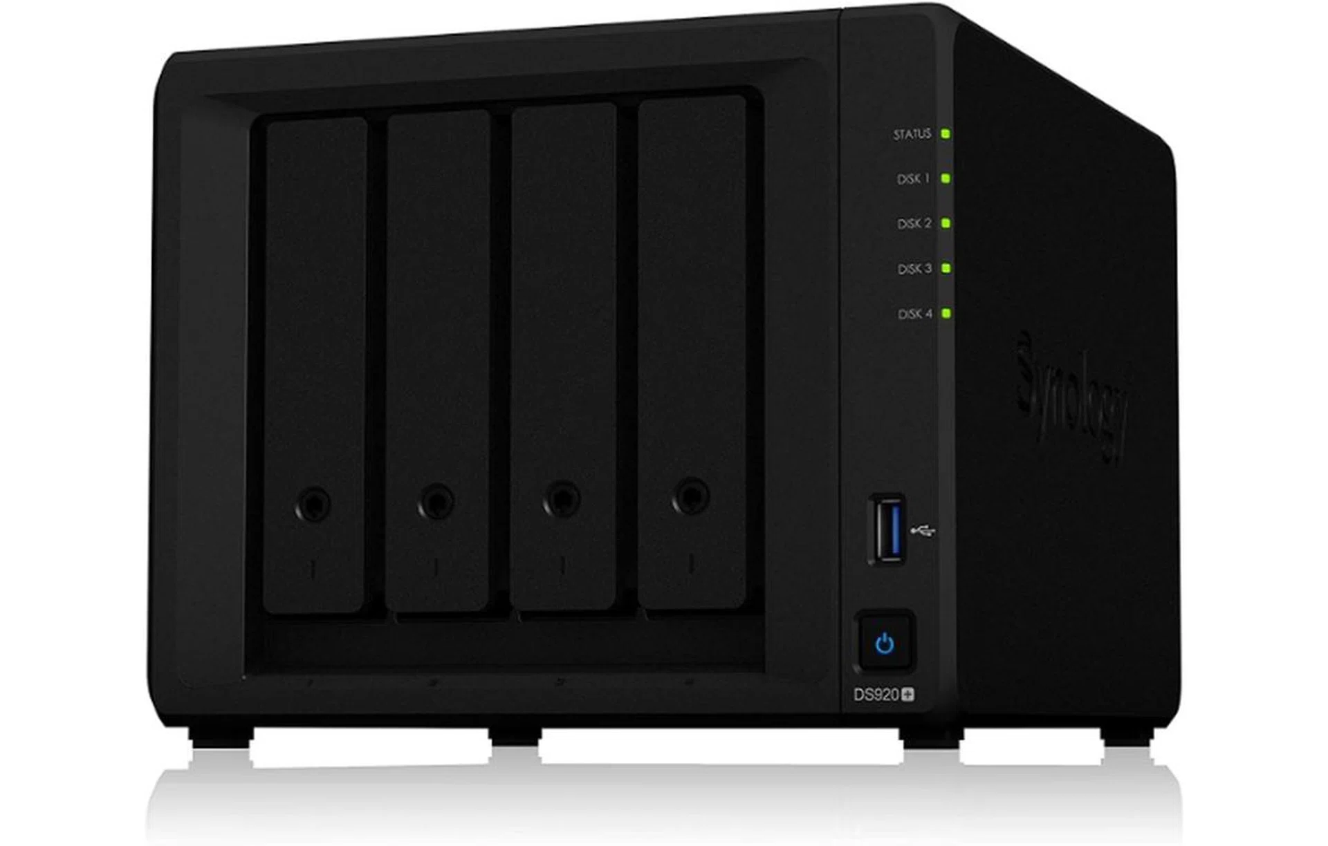 The Synology Diskstation DS920+ 4 Bay NAS comes with an Intel Celeron 2GHz Quad-Core Processor and 4GB of RAM. It can be populated with 2.5-inch and 3.5-inch SATA or SSD drives (hot-swappable). Sequential read and write throughput is over 225 MB/s.