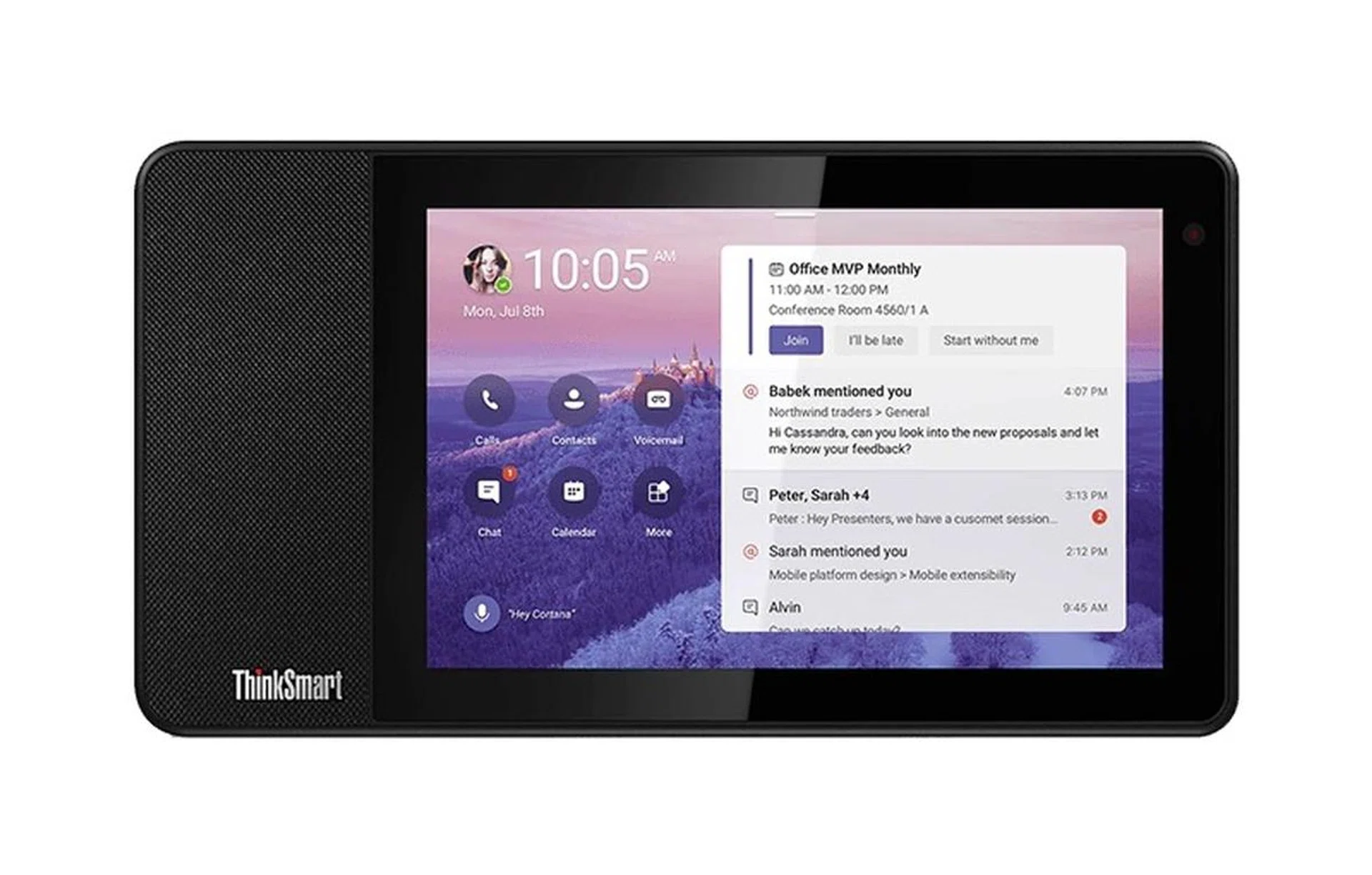The Lenovo ThinkSmart View was designed for video conferencing and specifically for Microsoft Teams. It features an 8-inch IPS touchscreen display with a resolution of 1,280 x 800 pixels and a front-facing 5-megapixel 720p wide-angle camera. For audio, it has a 1.75-inch full-range speaker and two passive tweeters. To capture audio, it has two 360 degrees microphones.