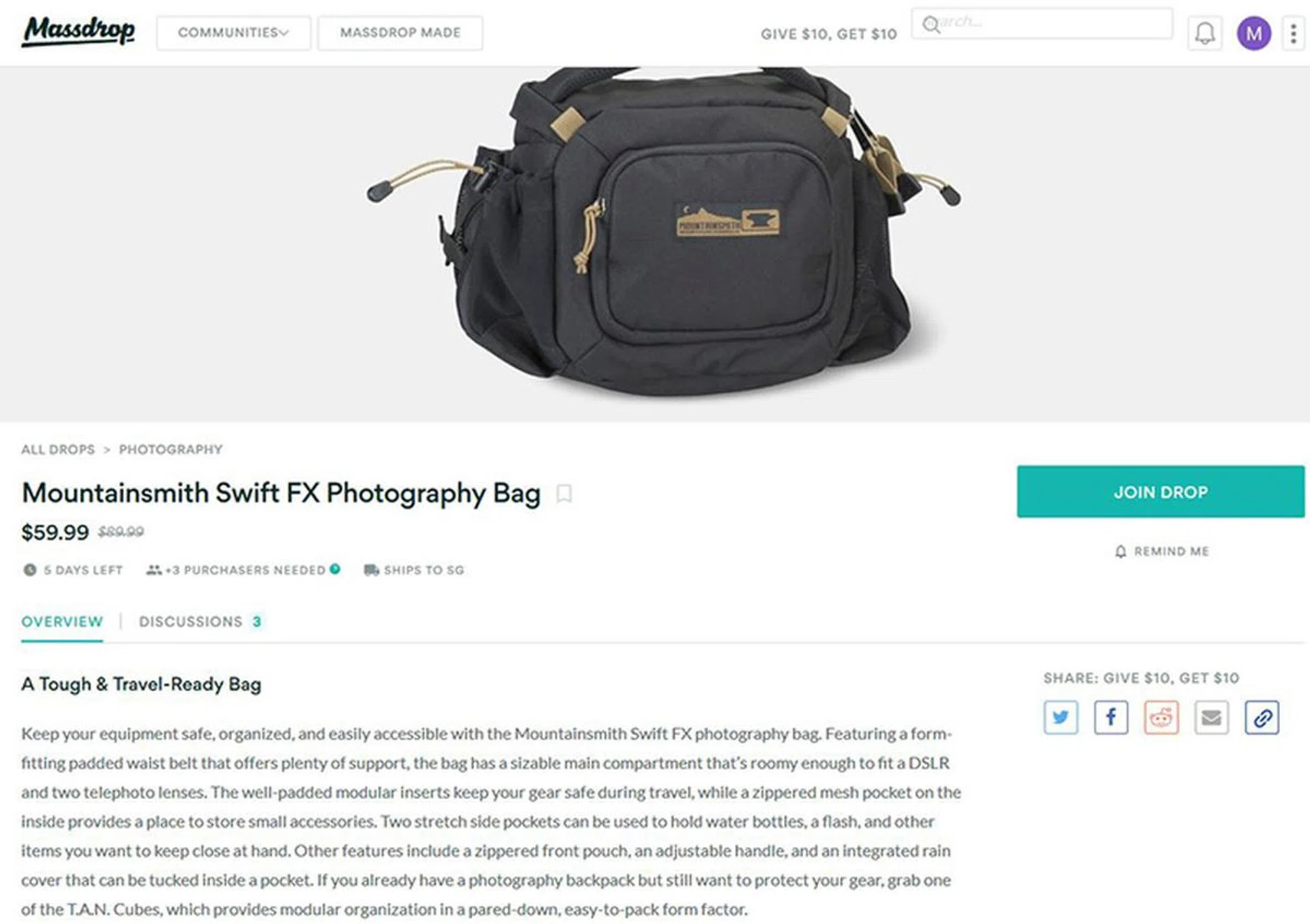 Photographers, this last one is for you. Massdrop has an offer on the Mountainsmith Swift FX photography bag, so you can get it for US$59.99 instead of the usual of US$89.99, a savings of US$30.00! Not too bad for this sling bag made of 610d Cordura HP with 5000mm PU coating for better protection against the elements. Head here to buy it now!