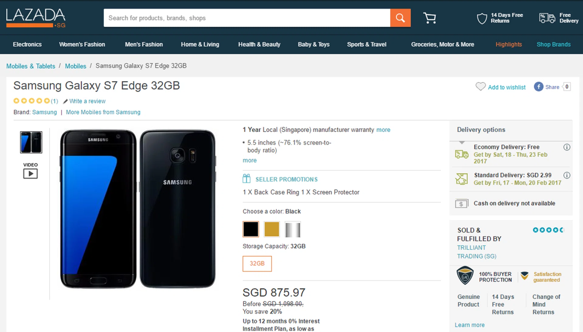 It’s been a while since we saw a flagship Samsung product with a tantalizing discount. Over at Lazada, you can find the Samsung Galaxy S7 Edge (32GB) retailing at S$875.97. Originally at S$1,098, the 5.5-inch S7 Edge still reigns as Samsung current flagship offering, until the S8 models decide to show up.