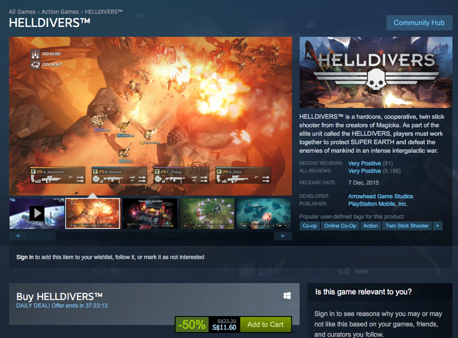 Helldivers might not be the easiest game to pick up and play, but if you and your friends are looking to try your hands at a co-operative shoot 'em up, few games are as hectic, maniac, and fun. Helldivers is available now with a 50% discount, bringing its price down to S$11.60.