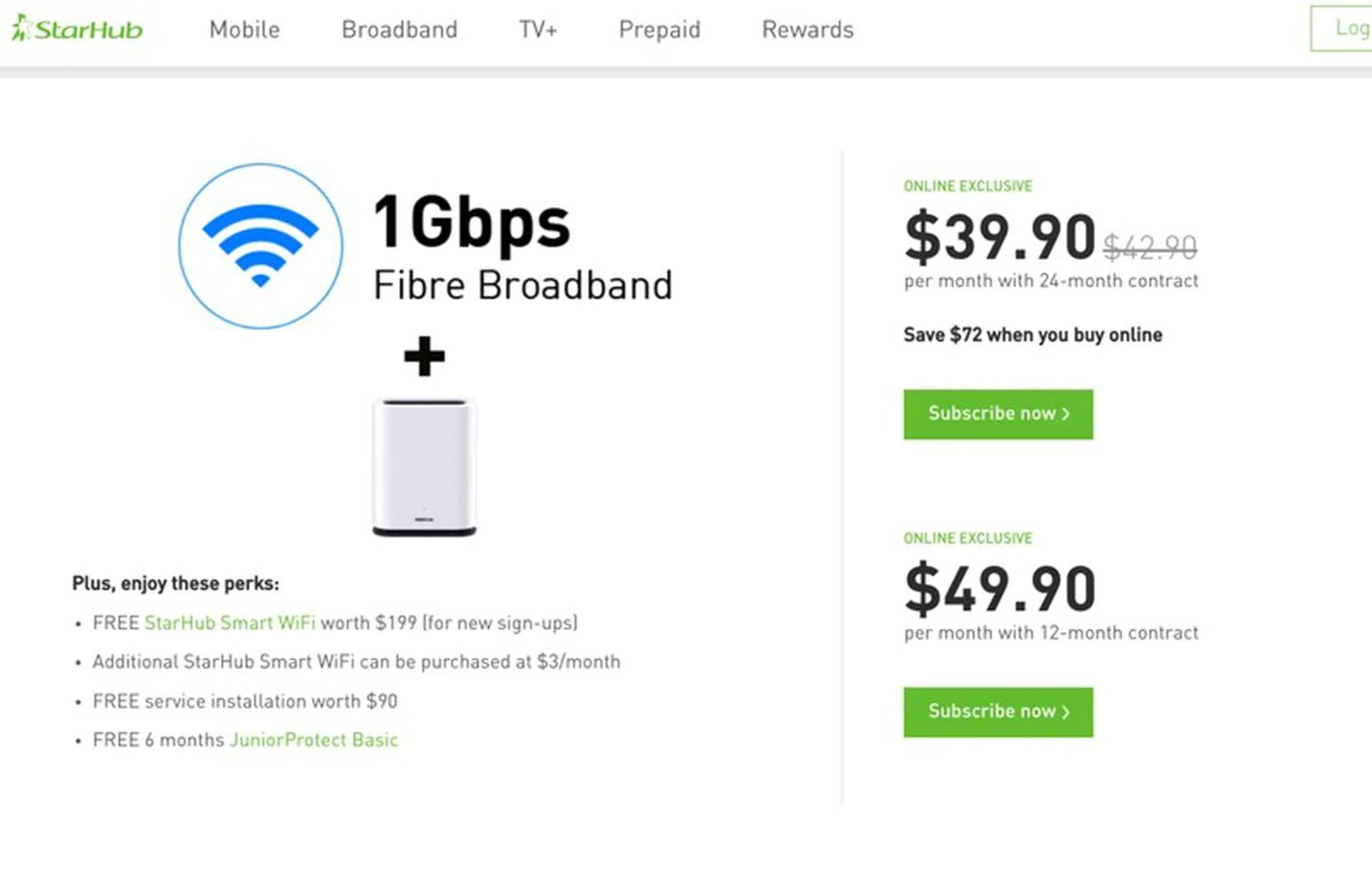 StarHub is the only provider here to allow subscribers to take up a 1Gbps package for 12 or 24 months. These will cost S$49.90 and S$39.90 respectively.
