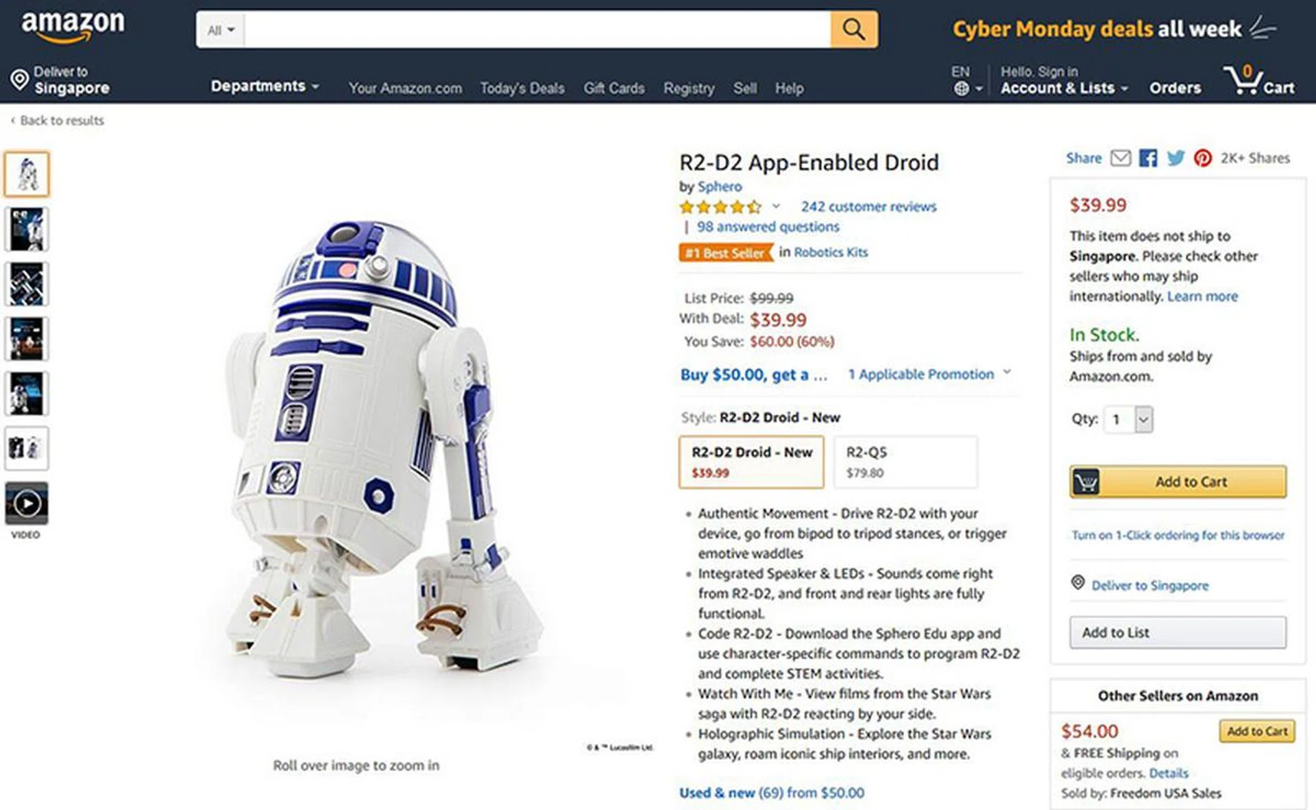 Those of us who grew up on the original Star Wars will probably associate better with R2-D2 then BB-8, so here's a deal on an R2-D2 you can control via an app from your phone. It has an integrated speaker and LEDs with fully functional front and rear lights and can even be programmed via the Sphero Edu app for custom movements. It's going on sale at Amazon for US$39.99 now, down a massive 60% from the original price of US$99.99. It doesn't ship direct to Singapore, but our handy guide shows you just how to get around that.