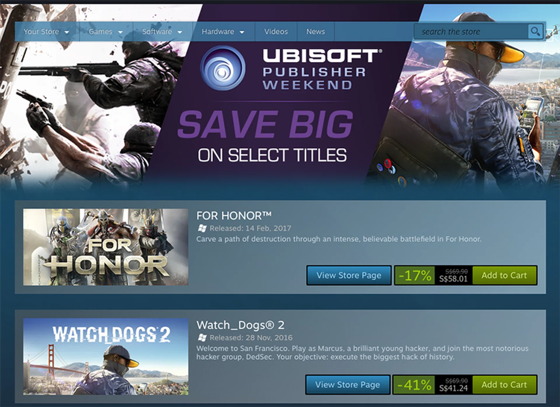 Ubisoft is one of the world's largest game publisher and is behind games like Assassin's Creed, Watch Dogs, and more recently, For Honor. Steam is having a Ubisoft Publisher Weekend now where you can get Ubisoft games on pretty great discounts. For example, For Honor is going for 17% off at S$58.01, while Watch Dog 2 is going for 41% off at S$41.24.