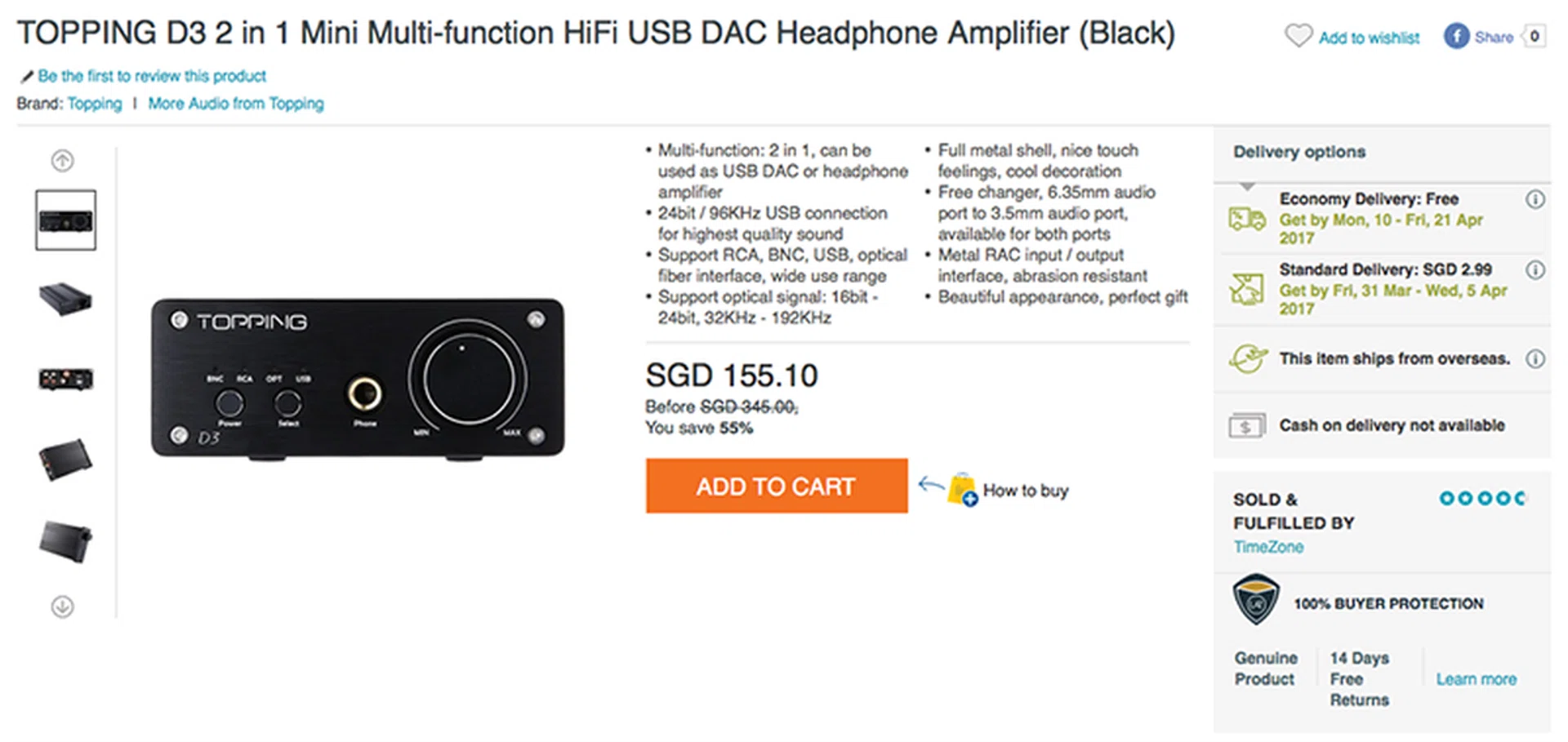 Getting an external DAC is a relatively inexpensive way of improving the sound quality of your desktop setup, and the Topping D3 features a Cirrus-Logic CS4398 DAC that supports PCM signals up to 24-bits/192kHz. In addition, it has USB, optical TOSLINK, BNC and RCA inputs, allowing users to connect multiple sources to it at once. Finally, the Topping D3 is also a decent headphone amplifier and can support headphones of up to 600 Ohms. It is going for S$155.10 (U.P S$345).