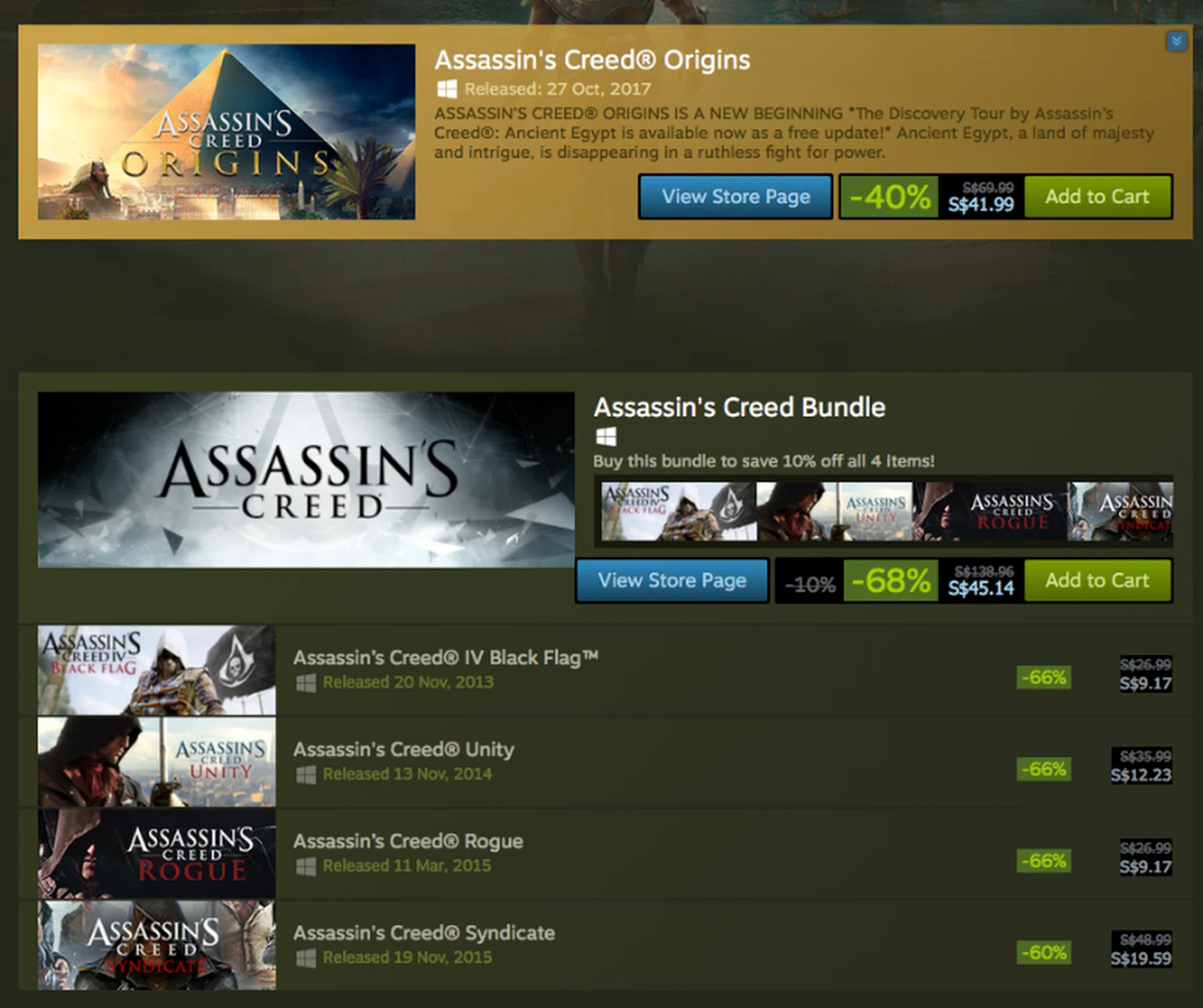 Steam has a promotion for all games in the Assassin's Creed franchise. The latest game in the series - Assassin's Creed: Origins - going for 40% off at S$41.99. Older titles like Assassin's Creed IV: Black Flag can be had for just S$9.17.