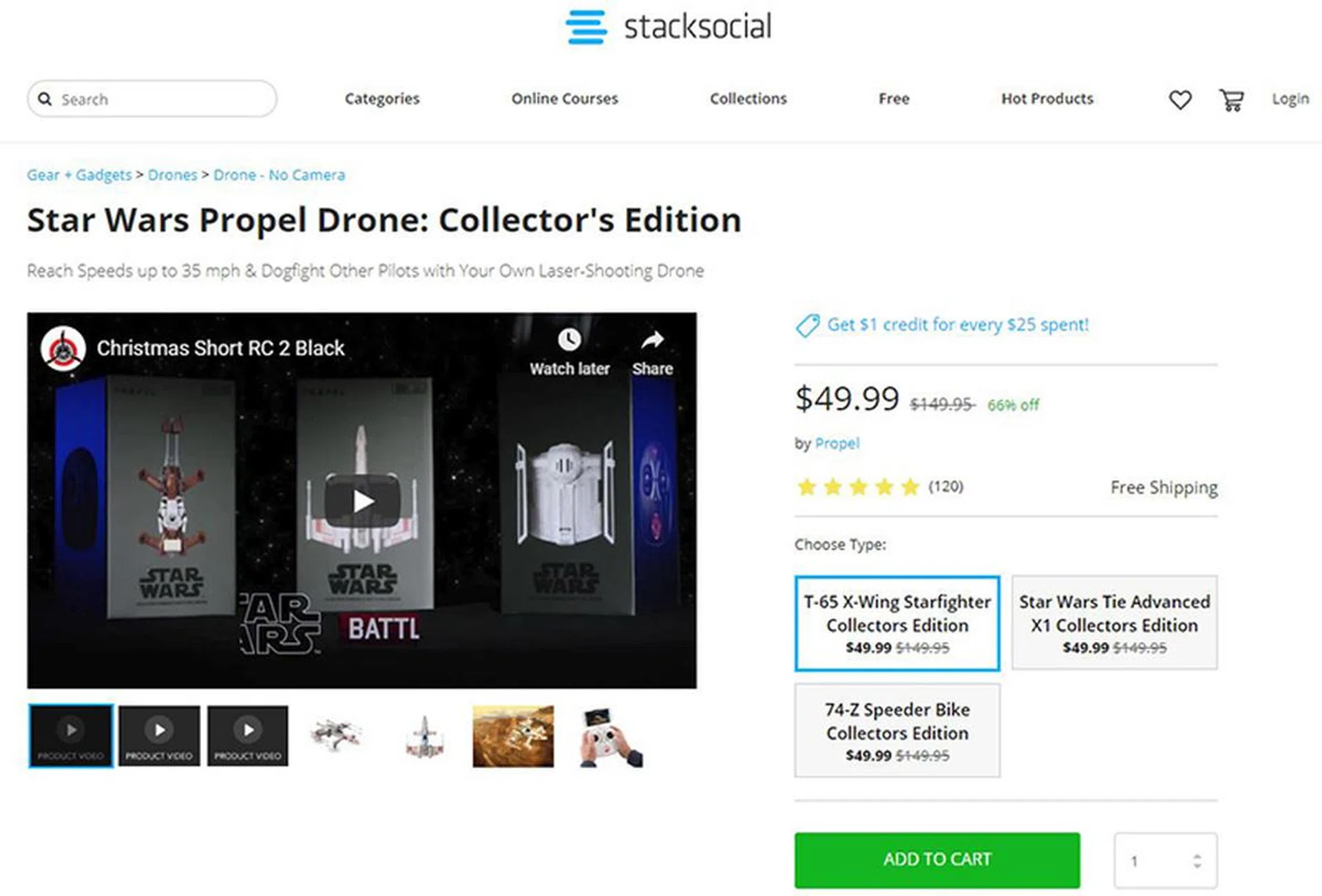 It's a T-65 X-Wing you can actually fly and it's on a massive discount, down from US$149.95 to US$49.99. Shouldn't really need more than that, but it also comes with a display case that plays music from the movie and does stunts at a touch of a button. Awesome! Grab it here!