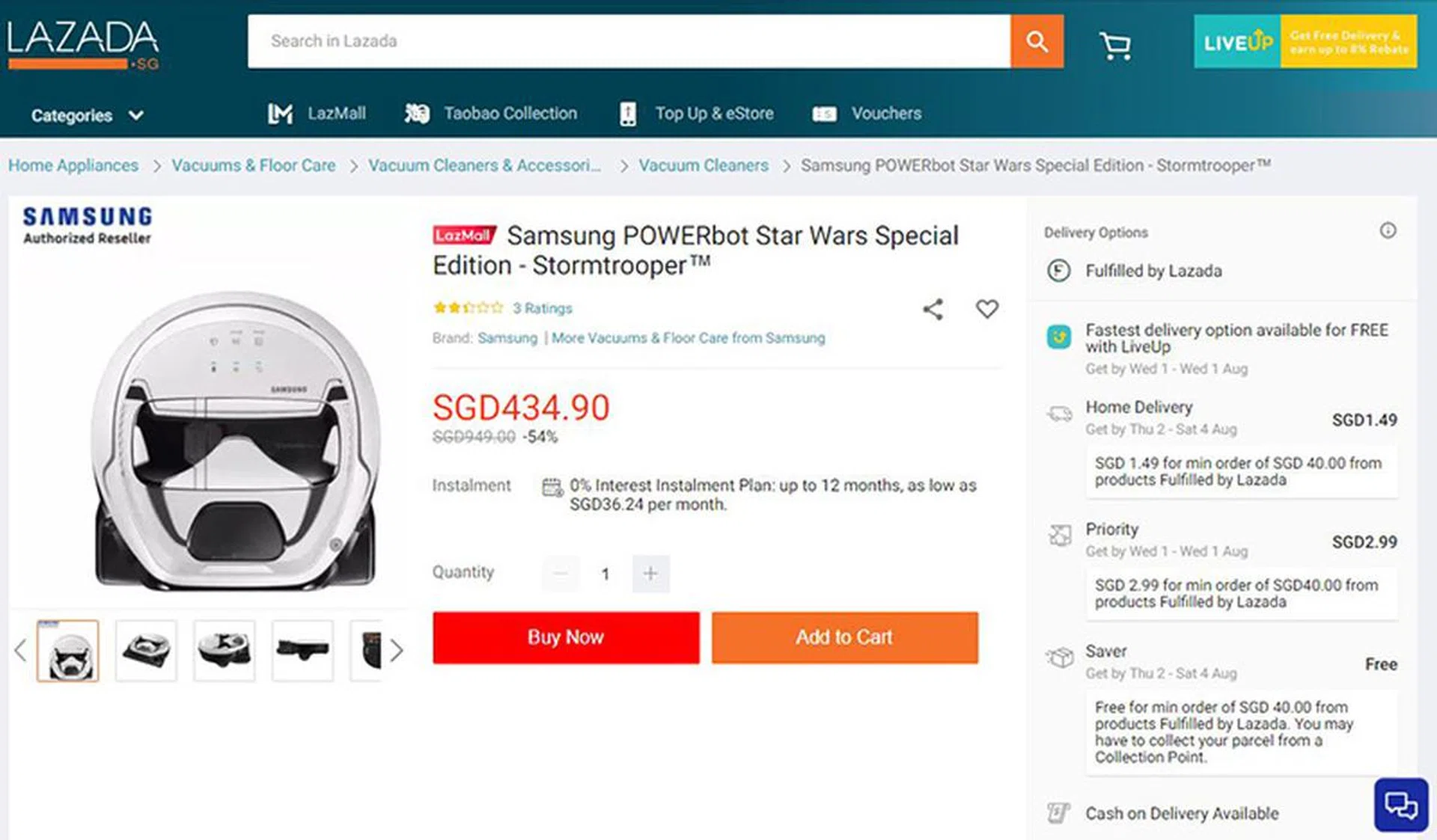 This really shouldn't need any explanation. The Stormtrooper version of Samsung's POWERbot vacuum cleaner is now on sale at Lazada, going for just S$434.90 instead of the usual price of S$949.00. That's more than S$500 off for a robot vacuum that maps and remembers the contours of every room in your home so you can get a good clean without having to do a thing. Get it here!