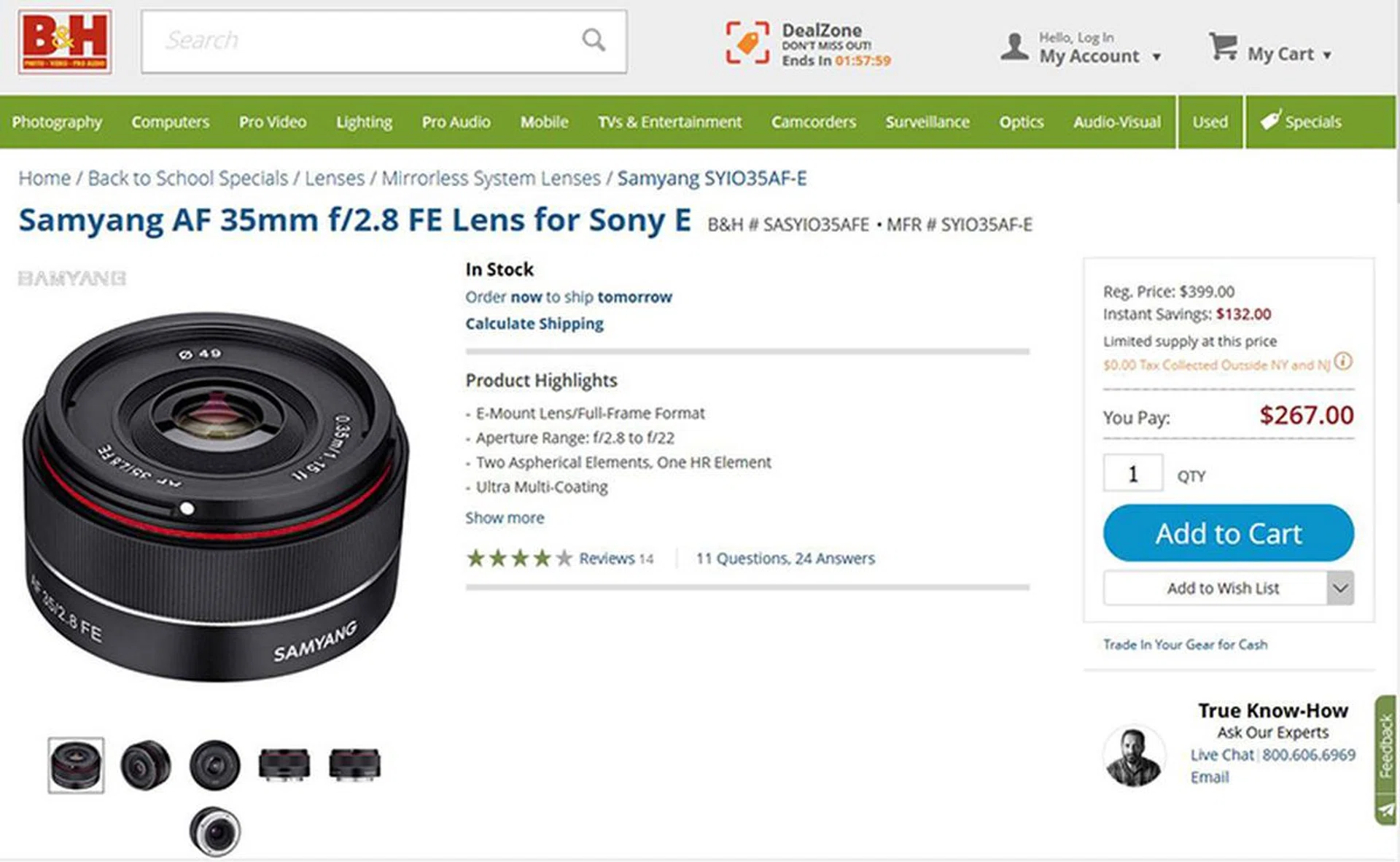 Also on B&H, is this great deal for the Samyang AF 35mm f/2.8 lens for Sony E-mount. Here's a moderate wide-angle prime for full-frame cameras that's both light and small, while offering a wide 63.1o field of view. It's also got a minimum focusing distance of just 35cm, letting you get close enough for dramatic food shots. Get it from B&H for just US$267.00, down a massive US$132.00 from their regular price of US$399.00!
