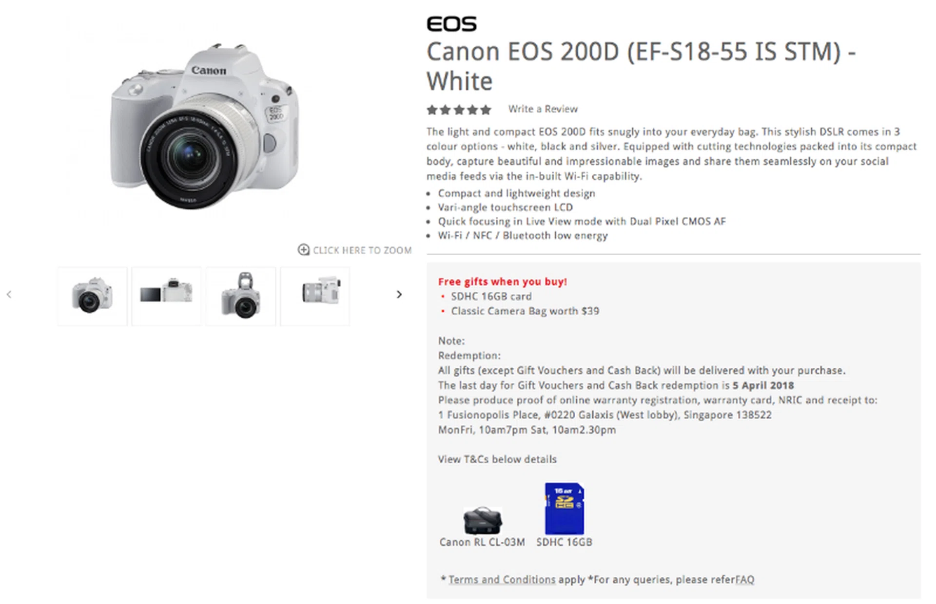 As part of International Women's Day, Canon is offering 10% off on all products on its online store. Simply use the promo code: SUPERWOMAN. A worthy buy is the relatively new EOS 200D. It features a 24.2 mega-pixel APS-C sensor, DIGIC 7 image processor, and a vari-angle touchscreen LCD for creative shooting. With the code, you can get it for S$854.10 (U.P S$949). A free Canon camera bag and 16GB SDHC completes the package.