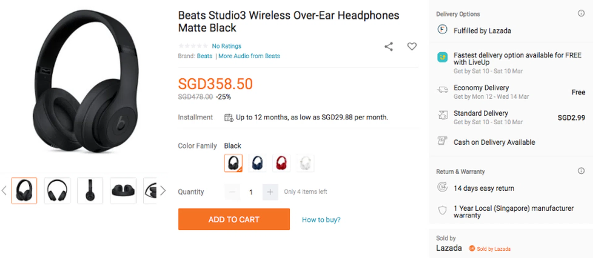 The Studio3 is Beats' flagship headphone. It is powered by Apple's W1 wireless chip and it features Pure Adaptive Noise Canceling (Pure ANC) technology. Battery life is rated at 22 hours with Pure ANC on and a staggering 40 hours with Pure ANC off. And if you are out of battery, a 10 minute charge is enough to give you an additional 3 hours of play. As part of Lazada's Back to School special, you can get it now for S$358.50 (U.P S$478), which represents savings of S$119.50!