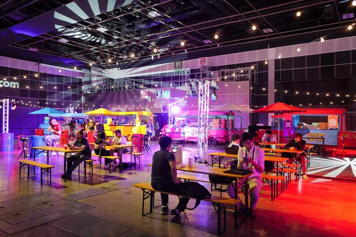 If you're tired and hungry from gaming overdose, there are food trucks (sort of) that serve finger food and beer ($10 a pint). I highly recommend the beer.