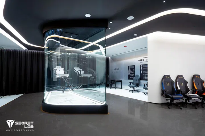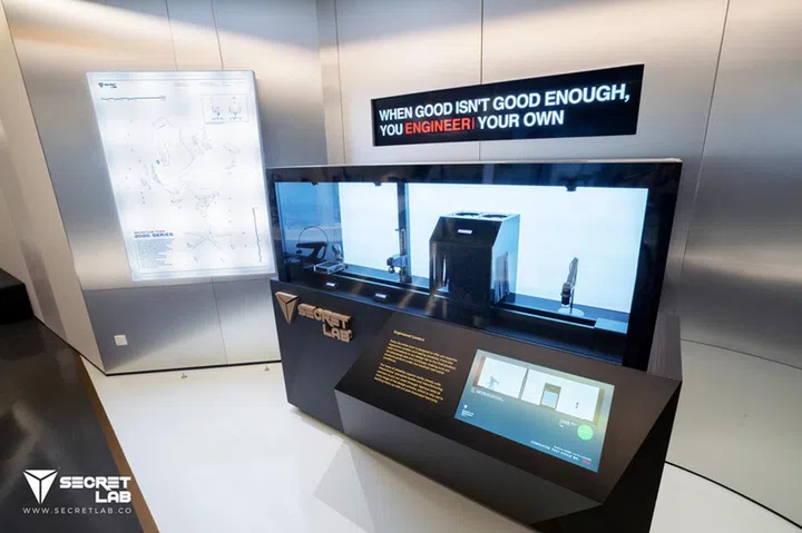 In the center of Secretlab's upgraded showroom and customer experience center, they have created a display exhibit of their chair where customers can see the different mechanisms and parts engineered by the company.