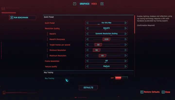 One helpful feature with Cyberpunk’s settings is the “For this Mac” graphic preset. If you enable this preset, the game will automatically apply the optimal graphics settings to attain a 30fps frame rate. In other words, it automatically balances performance and graphics fidelity. This eliminates the guesswork required for gamers to get a decent gaming experience.