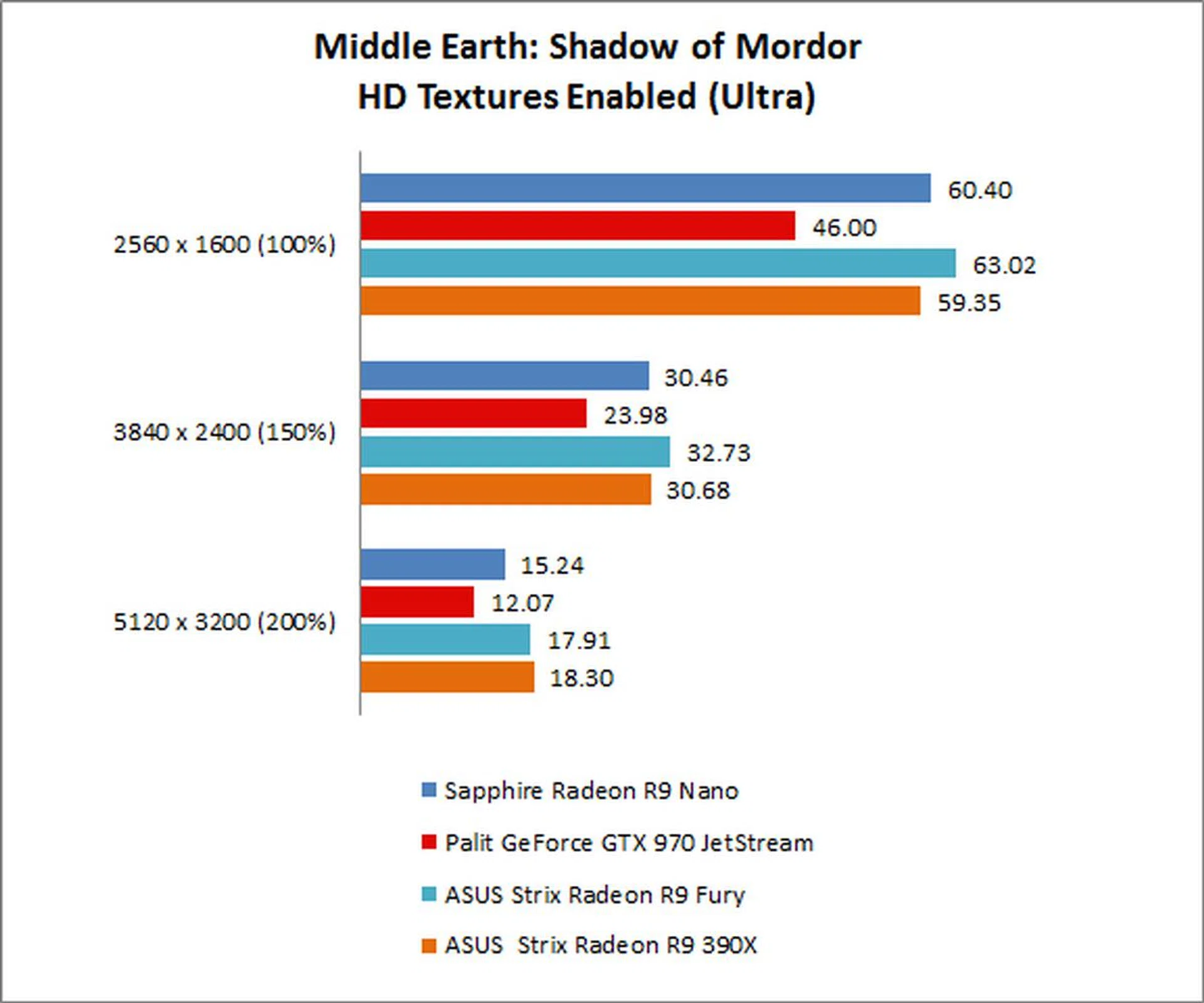 Memory bandwidth plays a big factor in our Middle-earth: Shadow of Mordor benchmark, where we deliberately scale up the resolution to ultra-high settings to test the cards’ ability to deal with such scenarios. At a resolution of 2,560 x 1,600 pixels, which is also the resolution closest to what most gamers are likely to play at, the Radeon R9 Nano proved to be around 31% faster than the GeForce GTX 970. It even managed 30.46fps at a resolution of 3,840 x 2,400 pixels, while the GeForce GTX 970 pushed closer to 20fps, arguably the bare minimum required to have a playable experience of any sort.