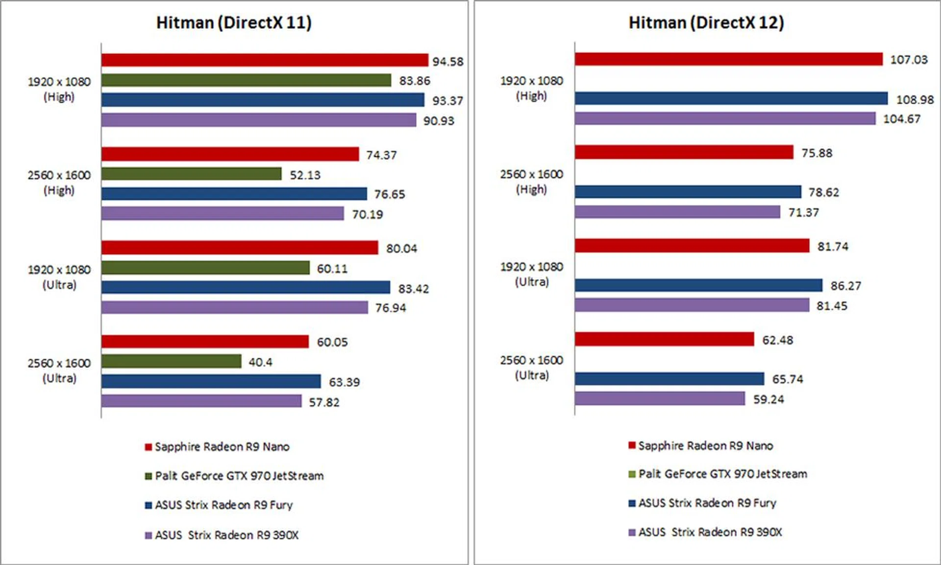 In DirectX 11, the Nano also demonstrated quite a large lead over the GeForce GTX 970, as much as a 33% advantage at 1080p and Ultra settings. This bodes well for AMD’s mini-ITX card, seeing as Hitman is one of the latest PC titles to hit the market.