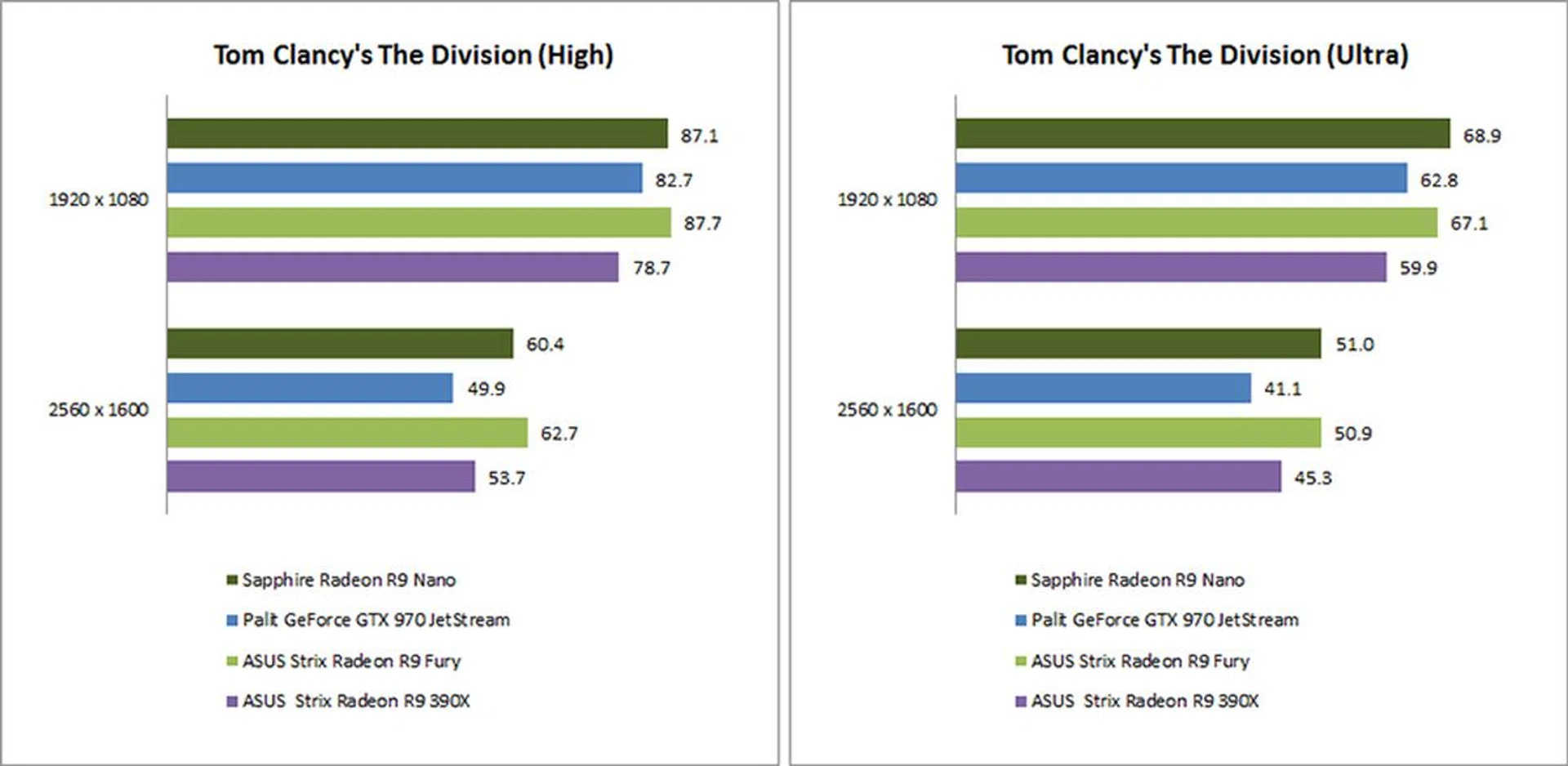 The results we observed in The Division reminded us of what we saw in Crysis 3, where the performance differential between the Radeon R9 Nano and GeForce GTX 970 widened as the benchmark became more graphically demanding. The GeForce GTX 970 performed decently against the Nano at 1080p resolutions, but once we moved up to 1600p, the gap grew to a hefty 24%.