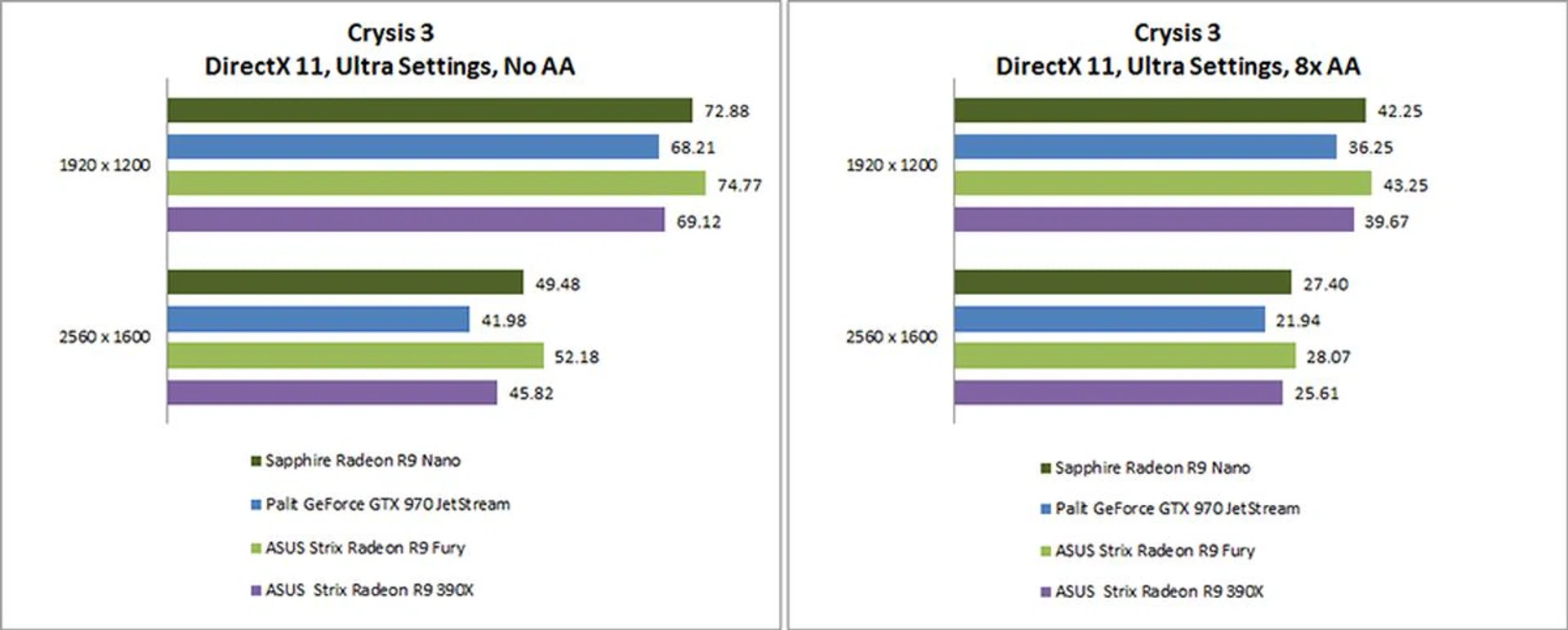 In Crysis 3, the performance gap between the GeForce GTX 970 and the Radeon R9 Nano widened as the display resolution and anti-aliasing settings became more demanding. At the most trying settings – 2,560 x 1,600 pixels and 8x AA – the Nano was almost 25% faster than the NVIDIA card.