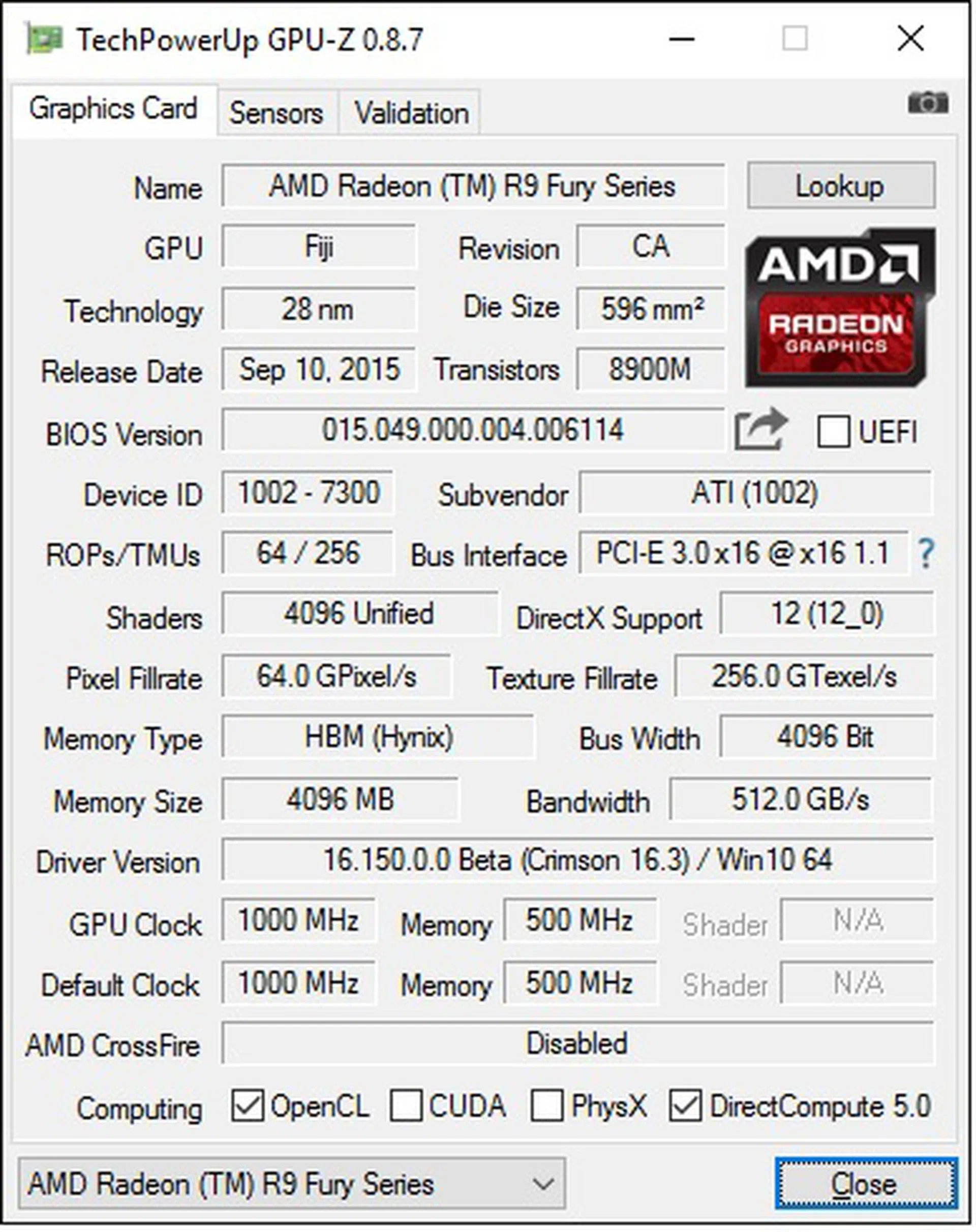 - Sapphire Radeon R9 Nano (Radeon Software Crimson Edition 16.3.1)