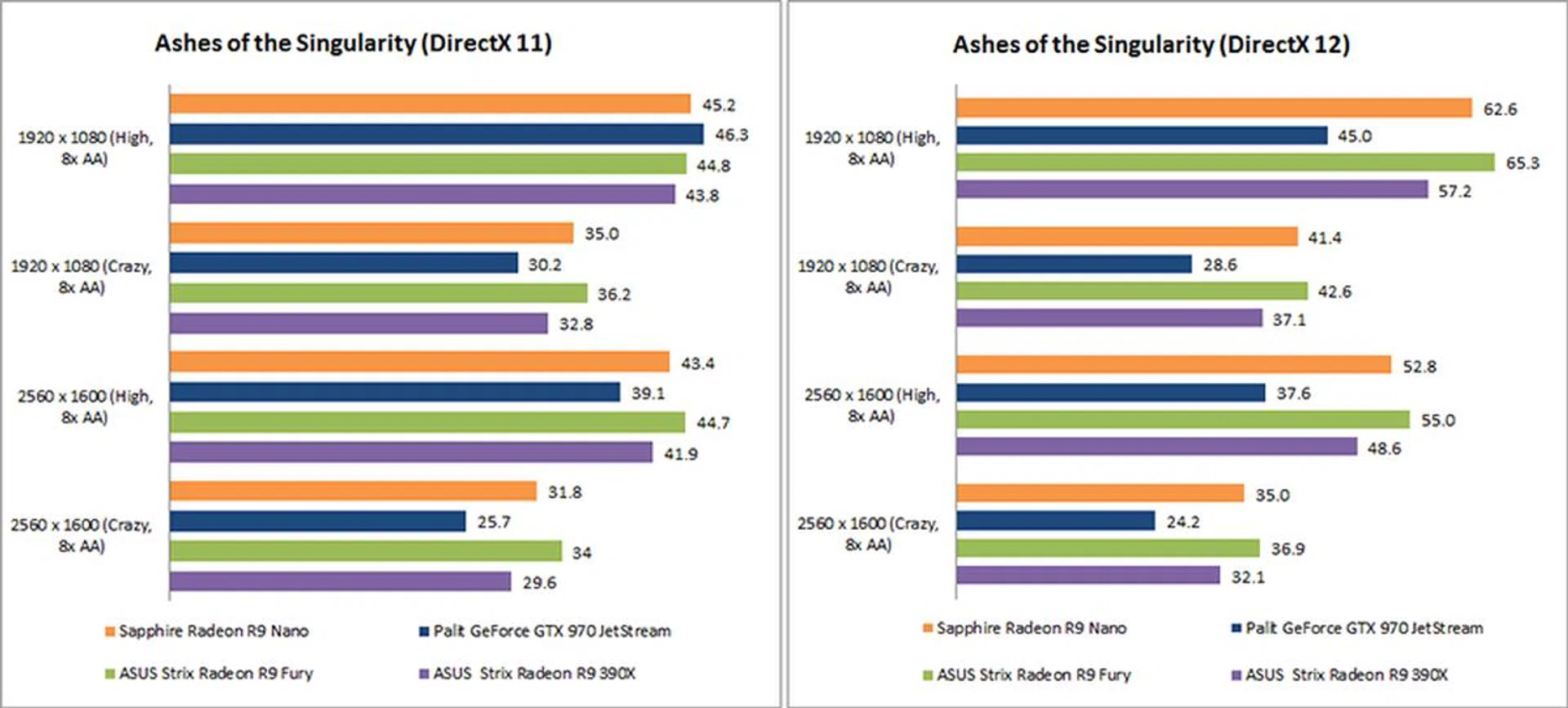Then there is the huge tilt in AMD’s favor when it comes to DirectX 12 performance, or even getting the game to work with the new API at all. While it might be premature to conclude based on just a single game (Ashes of the Singularity) that the Radeon R9 Nano (and other AMD cards with ACEs by extension) benefits more than the GeForce GTX 970 from the shift to DirectX 12, it is certainly looking that way at this point. Of course, we’ll still need to run further comparisons on more games as they become available to be really sure.