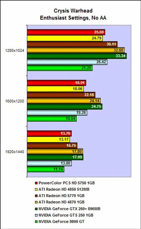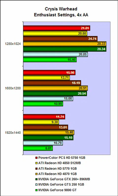 As expected, the PowerColor PCS 5750 PE managed frame rates that were comparable to the Radeon HD 4850, although it did come out slightly faster. It also performed similarly to NVIDIA's GeForce GTS 250. However, the frame rates most of these cards were churning tell us that despite the new technology, Crysis Warhead on Enthusiast settings remains to be something only the most powerful graphics cards could hope to handle.