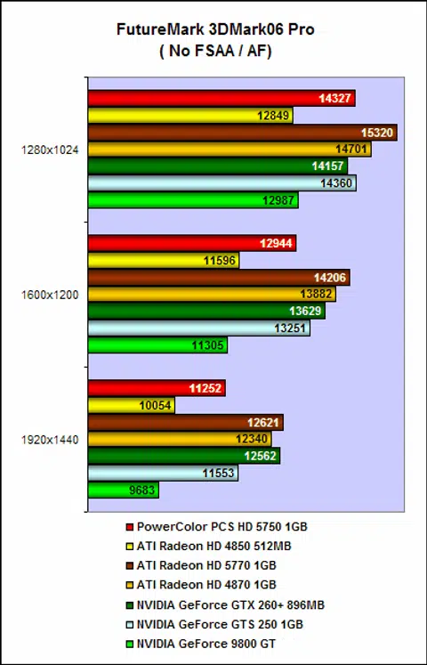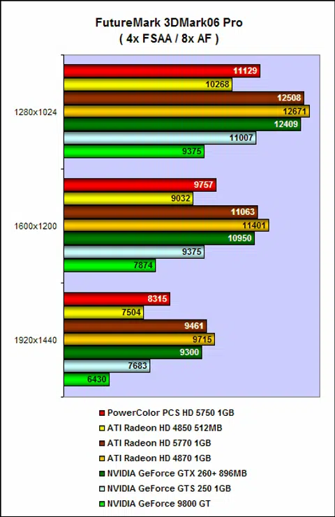 We begin with the widely used 3DMark06 benchmark, and the PowerColor PCS 5750 PE performed decently well, posting scores that were about 10% lower than the more powerful Radeon HD 5770. It also did significantly better than the older Radeon HD 4850. Against the NVIDIA cards, it was comprehensively beaten by the GeForce GTX 260+, but was more than a match for the GeForce GTS 250. So far sounds good.