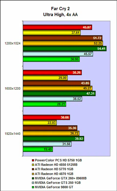 Despite the ultra-high settings on Far Cry 2, the new PowerColor PCS 5750 PE performed reasonably well, putting in decent and playable frame rates on the less intensive settings. It blitzed the Radeon HD 4850 thanks to its larger 1GB frame buffer, which is always useful when anti-aliasing is enabled. Again, we can see that it is almost comparable with the GeForce GTS 250.