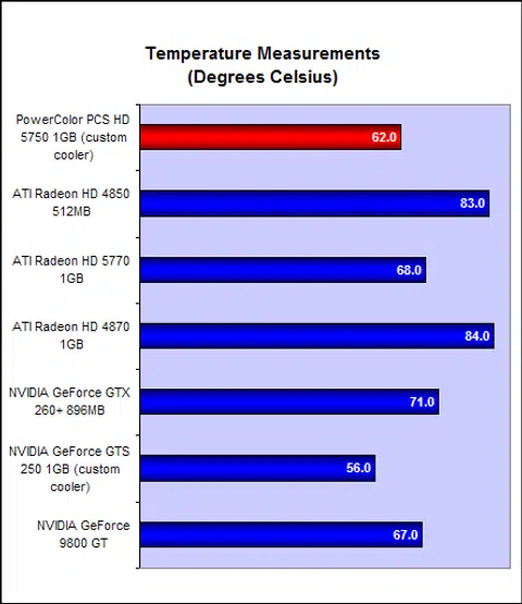 Last but not least for this segment, the PowerColor PCS 5750 PE is way cooler than the stock Radeon HD 4850 graphics card when considering that both are in the same performance and price segment.