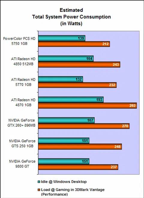 Great power efficiency is the hallmark of an Evergreen card and the PowerColor PCS 5750 PE didn't disappoint, clocking the lowest figures in this category. Its power consumption figures were lower even than a GeForce 9800 GT, which is certainly impressive if you consider just how much more powerful the Radeon HD 5700 series cards are.