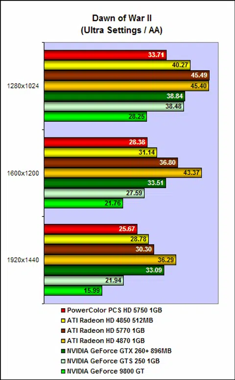 Dawn of War 2 proved tricky for the PowerColor PCS 5750 PE as it performed significantly poorer than the Radeon HD 4850. However, it continued to maintain parity against the GeForce GTS 250. We think its poor performance could be due to the fact that the drivers the PowerColor card is running on is still in Beta. Hopefully once these new Evergreen cards receive proper drivers, performance on Dawn of War 2 will improve.
