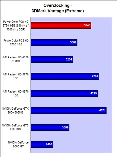 The PowerColor PCS 5750 PE was a willing overclocker as we managed to push it up to 830MHz at the core and a staggering 5000MHz DDR at the memory using the built-in ATI Overdrive utility. This meant a 130MHz and 400MHz DDR bump in core and memory clock speeds respectively. This gave us 3948 3DMarks, which translates to an improvement of about 16%.