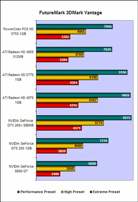 Moving on to 3DMark Vantage, it was a slightly different story. The Radeon HD 5770 maintained its lead over the PowerColor PCS 5750 PE, but this time, the PowerColor card was only on par with the Radeon HD 4850. That said, it did record slightly better scores than the GeForce GTS 250.